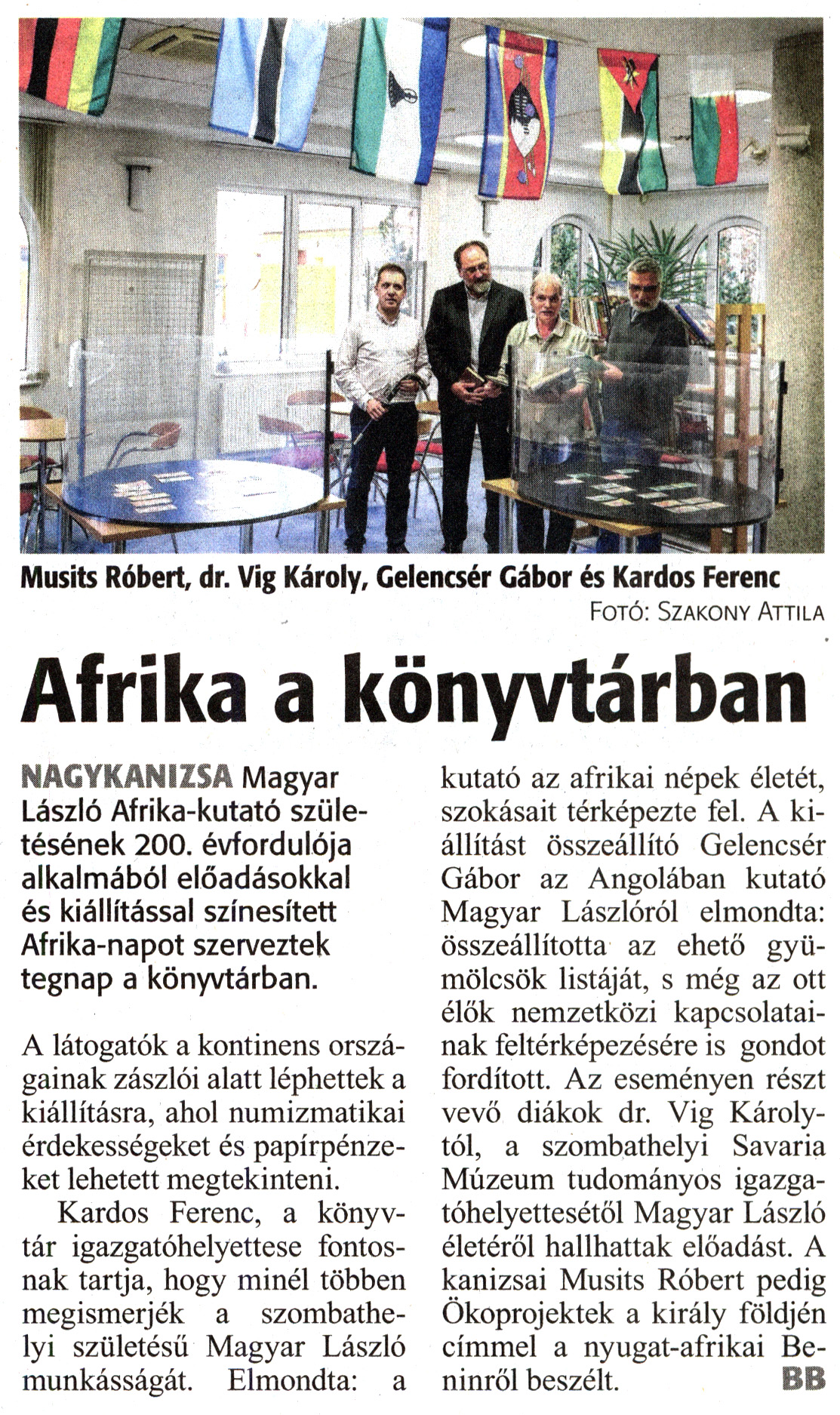 Nyilvános 1531 | 2583 | Zalai Hírlap 2018. november 14. 264. szám 4. oldal - Afrika a könyvtárban | Musits Róbert, dr. Vig Károly, Gelencsér Gábor és Kardos Ferenc Fotó: Szakony Attila Afrika a könyvtárban NAGYKANIZSA Magyar László Afrika-kutató születésének 200. évfordulója alkalmából előadásokkal és kiállítással színesített Afrika-napot szerveztek tegnap a könyvtárban. A látogatók a kontinens országainak zászlói alatt léphettek a kiállításra, ahol numizmatikai érdekességeket és papírpénzeket lehetett megtekinteni. Kardos Ferenc, a könyvtár igazgatóhelyettese fontosnak tartja, hogy minél többen megismerjék a szombathelyi születésű Magyar László munkásságát. Elmondta: a kutató az afrikai népek életét, szokásait térképezte fel. A kiállítást összeállító Gelencsér Gábor az Angolában kutató Magyar Lászlóról elmondta: összeállította az ehető gyümölcsök listáját, s még az ott élők nemzetközi kapcsolatainak feltérképezésére is gondot fordított. Az eseményen részt vevő diákok dr. Vig Károlytól, a szombathelyi Savaria Múzeum tudományos igazgatóhelyettesétől Magyar László életéről hallhattak előadást. A kanizsai Musits Róbert pedig Ökoprojektek a király földjén címmel a nyugat-afrikai Beninről beszélt. BB |