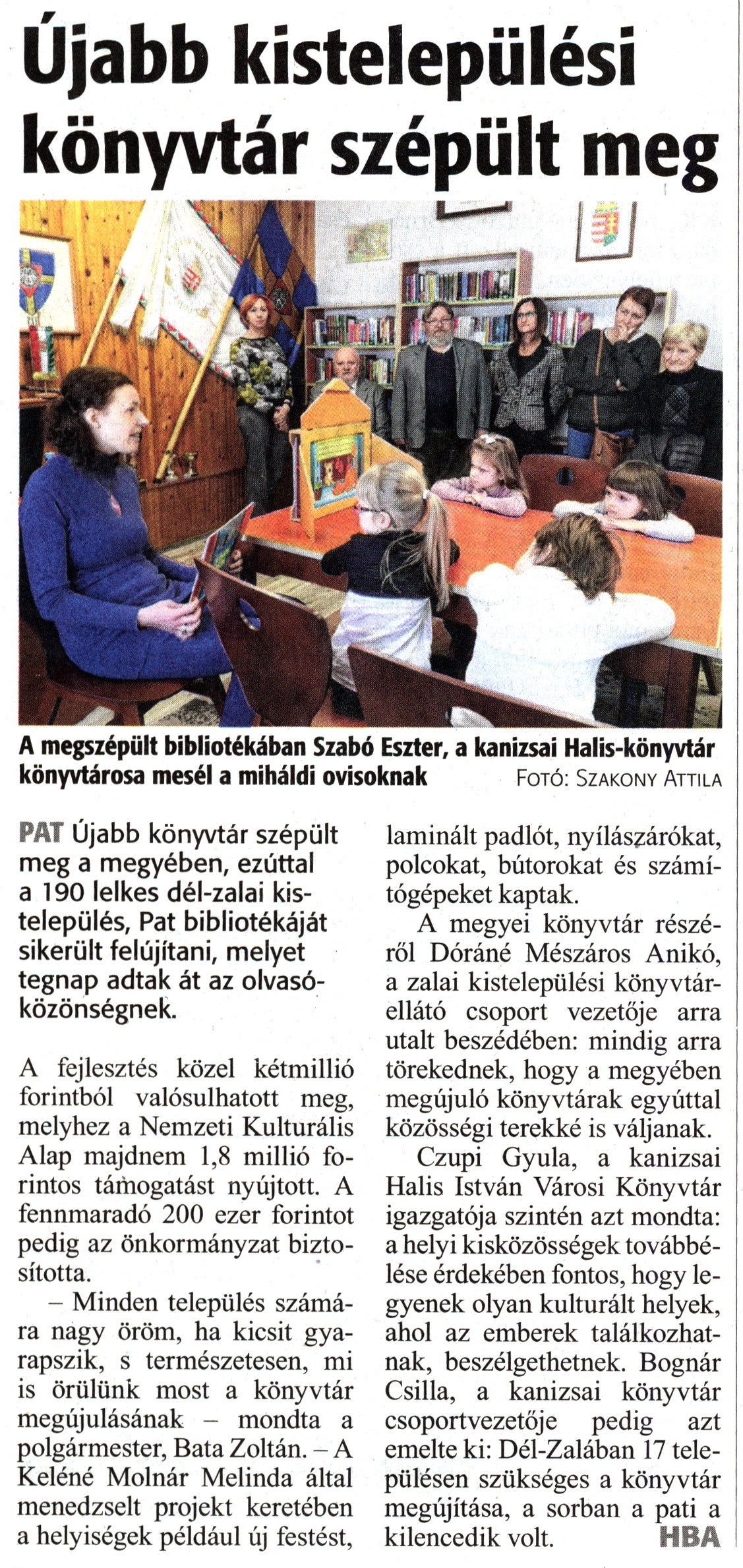 Nyilvános 1570 | 2731 | Zalai Hírlap 2018. december 1. 279. szám 16. oldal | Újabb kistelepülési könyvtár szépült meg A megszépült bibliotékában Szabó Eszter, a kanizsai Halis-könyvtár könyvtárosa mesél a miháldi ovisoknak Fotó: Szakony Attila PAT Újabb könyvtár szépült meg a megyében, ezúttal a 190 lelkes dél-zalai kistelepülés, Pat bibliotékáját sikerült felújítani, melyet tegnap adtak át az olvasóközönségnek. A fejlesztés közel kétmillió forintból valósulhatott meg, melyhez a Nemzeti Kulturális Alap majdnem 1,8 millió forintos támogatást nyújtott. A fennmaradó 200 ezer forintot pedig az önkormányzat biztosította. - Minden település számára nagy öröm, ha kicsit gyarapszik, s természetesen, mi is örülünk most a könyvtár megújulásának - mondta a polgármester, Bata Zoltán. - A Keléné Molnár Melinda által menedzselt projekt keretében a helyiségek például új festést, laminált padlót, nyílászárókat, polcokat, bútorokat és számítógépeket kaptak. A megyei könyvtár részéről Dóráné Mészáros Anikó, a zalai kistelepülési könyvtárellátó csoport vezetője arra utalt beszédében: mindig arra törekednek, hogy a megyében megújuló könyvtárak egyúttal közösségi terekké is váljanak. Czupi Gyula, a kanizsai Halis István Városi Könyvtár igazgatója szintén azt mondta: a helyi kisközösségek továbbélése érdekében fontos, hogy legyenek olyan kulturált helyek, ahol az emberek találkozhatnak, beszélgethetnek. Bognár Csilla, a kanizsai könyvtár csoportvezetője pedig azt emelte ki: Dél-Zalában 17 településen szükséges a könyvtár megújítása, a sorban a pati a kilencedik volt. HBA |