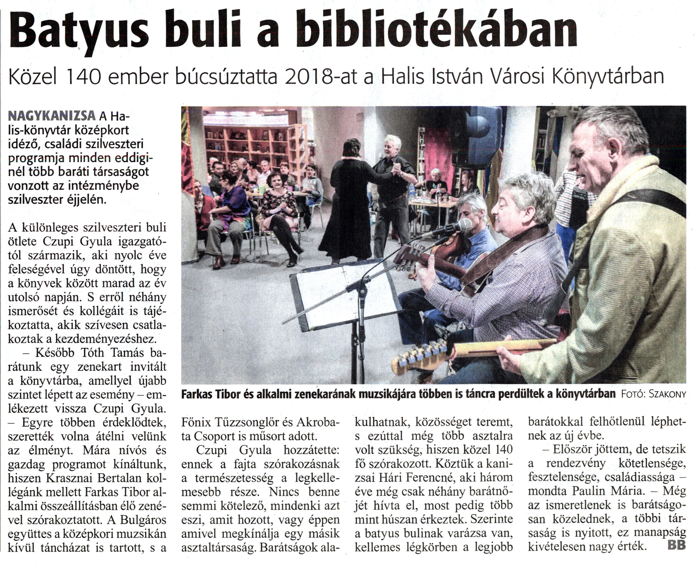 Nyilvános 1591 | 4945 | Zalai Hírlap 2019. január 2. 1. szám 3. oldal | Batyus buli a bibliotékában Közel 140 ember búcsúztatta 2018-at a Halis István Városi Könyvtárban Farkas Tibor és alkalmi zenekarának muzsikájára többen is táncra perdültek a könyvtárban Fotó: Szakony NAGYKANIZSA A Halis-könyvtár középkort idéző, családi szilveszteri programja minden eddiginél több baráti társaságot vonzott az intézménybe szilveszter éjjelén. A különleges szilveszteri buli ötlete Czupi Gyula igazgatótól származik, aki nyolc éve feleségével úgy döntött, hogy a könyvek között marad az év utolsó napján. S erről néhány ismerősét és kollégáit is tájékoztatta, akik szívesen csatlakoztak a kezdeményezéshez. - Később Tóth Tamás barátunk egy zenekart invitált a könyvtárba, amellyel újabb szintet lépett az esemény - emlékezett vissza Czupi Gyula. - Egyre többen érdeklődtek, szerették volna átélni velünk az élményt. Mára nívós és gazdag programot kínáltunk, hiszen Krasznai Bertalan kollégánk mellett Farkas Tibor alkalmi összeállításban élő zenével szórakoztatott. A Bulgáros együttes a középkori muzsikán kívül táncházat is tartott, s a Főnix Tűzzsonglőr és Akrobata Csoport is műsort adott. Czupi Gyula hozzátette: ennek a fajta szórakozásnak a természetesség a legkellemesebb része. Nincs benne semmi kötelező, mindenki azt eszi, amit hozott, vagy éppen amivel megkínálja egy másik asztaltársaság. Barátságok alakulhatnak, közösséget teremt, s ezúttal még több asztalra volt szükség, hiszen közel 140 fő szórakozott. Köztük a kanizsai Hári Ferencné, aki három éve még csak néhány barátnőjét hívta el, most pedig több mint húszan érkeztek. Szerinte a batyus bulinak varázsa van, kellemes légkörben a legjobb barátokkal felhőtlenül léphetnek az új évbe. - Először jöttem, de tetszik a rendezvény kötetlensége, fesztelensége, családiassága -mondta Paulin Mária. - Még az ismeretlenek is barátságosan közelednek, a többi társaság is nyitott, ez manapság kivételesen nagy érték. BB |