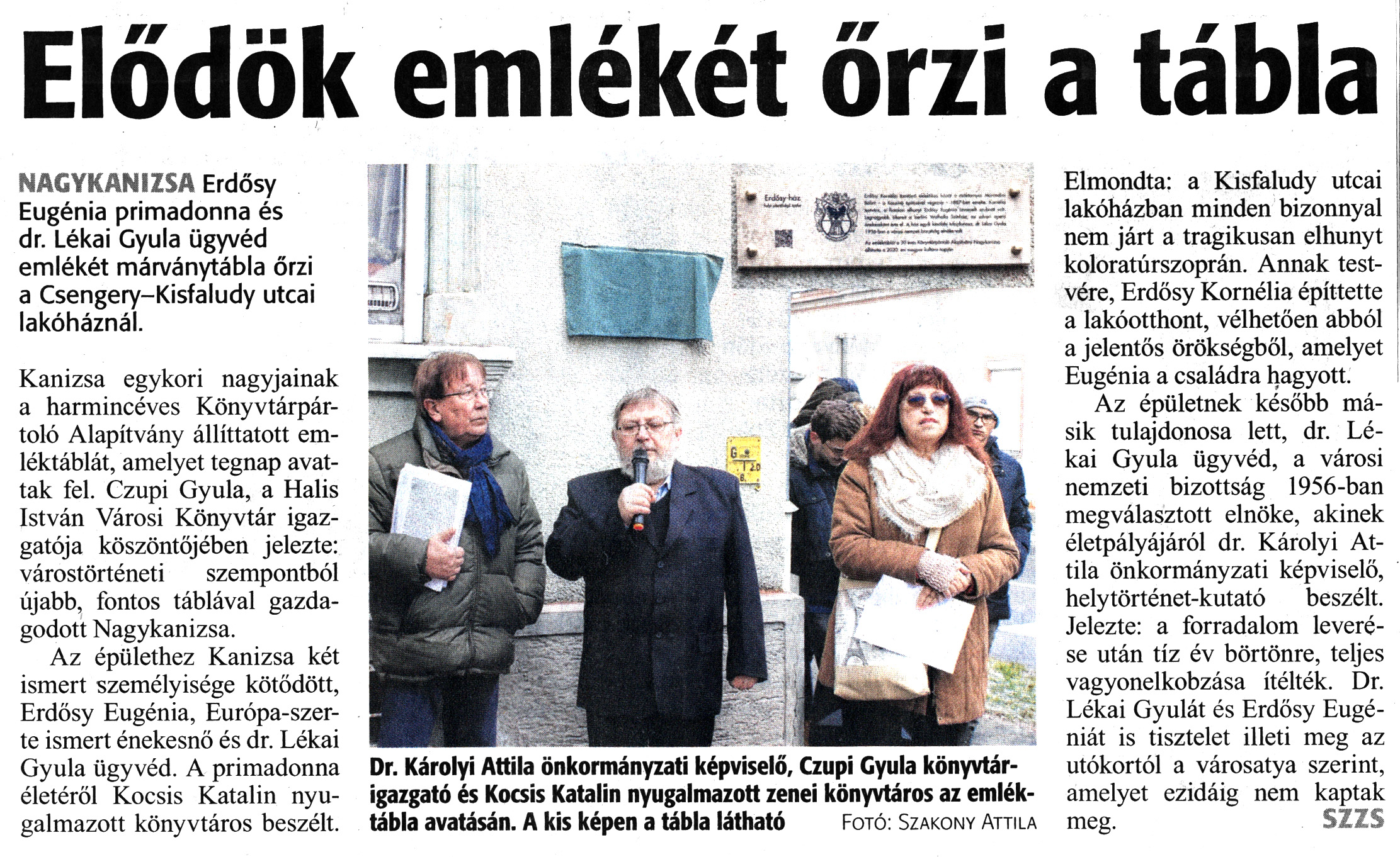Nyilvános 1409 | 2477 | Zalai Hírlap 2020. január 23. 19. szám 3. oldal | Elődök emlékét őrzi a tábla NAGYKANIZSA Erdősy Eugénia primadonna és dr. Lékai Gyula ügyvéd emlékét márványtábla őrzi a Csengery-Kisfaludy utcai lakóháznál. Kanizsa egykori nagyjainak a harmincéves Könyvtárpártoló Alapítvány állíttatott emléktáblát, amelyet tegnap avattak fel. Czupi Gyula, a Halis István Városi Könyvtár igazgatója köszöntőjében jelezte: várostörténeti szempontból újabb, fontos táblával gazdagodott Nagykanizsa. Az épülethez Kanizsa két ismert személyisége kötődött, Erdősy Eugénia, Európa-szerte ismert énekesnő és dr. Lékai Gyula ügyvéd. A primadonna életéről Kocsis Katalin nyugalmazott könyvtáros beszélt. Elmondta: a Kisfaludy utcai lakóházban minden bizonnyal nem járt a tragikusan elhunyt koloratúrszoprán. Annak testvére, Erdősy Kornélia építtette a lakóotthont, vélhetően abból a jelentős örökségből, amelyet Eugénia a családra hagyott. Az épületnek később másik tulajdonosa lett, dr. Lékai Gyula ügyvéd, a városi nemzeti bizottság 1956-ban megválasztott elnöke, akinek életpályájáról dr. Károlyi Attila önkormányzati képviselő, helytörténet-kutató beszélt. Jelezte: a forradalom leverése után tíz év börtönre, teljes vagyonelkobzása ítélték. Dr. Lékai Gyulát és Erdősy Eugéniát is tisztelet illeti meg az utókortól a városatya szerint, amelyet ezidáig nem kaptak meg. SZZS Dr. Károlyi Attila önkormányzati képviselő, Czupi Gyula könyvtárigazgató és Kocsis Katalin nyugalmazott zenei könyvtáros az emléktábla avatásán. A kis képen a tábla látható Fotó: Szakony Attila |