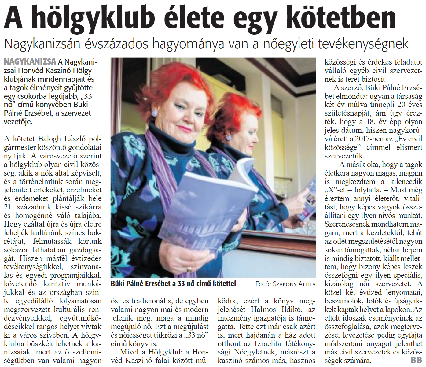 Nyilvános 1185 | 1584 | Zalai Hírlap 2020. május 6. 105. szám 13. oldal | A hölgyklub élete egy kötetben Nagykanizsán évszázados hagyománya van a nőegyleti tevékenységnek Büki Pálné Erzsébet a 33 nő című kötettel Fotó: Szakony Attila NAGYKANIZSA A Nagykanizsai Honvéd Kaszinó Hölgyklubjának mindennapjait és a tagok élményeit gyűjtötte egy csokorba legújabb, „33 nő" című könyvében Büki Pálné Erzsébet, a szervezet vezetője. A kötetet Balogh László polgármester köszöntő gondolatai nyitják. A városvezető szerint a hölgyklub olyan civil közösség, akik a nők által képviselt, és a történelmünk során megjelenített értékeket, érzelmeket és érdemeket plántálják bele 21. századunk kissé szikárrá és homogénné váló talajába. Hogy ezáltal újra és újra életre leheljék kultúránk színes bokrétáját, felmutassák korunk sokszor láthatatlan gazdagságát. Hiszen másfél évtizedes tevékenységükkel, színvonalas és egyedi programjaikkal, követendő karitatív munkájukkal és az országban szinte egyedülálló folyamatosan megszervezett kulturális rendezvényeikkel együttműködéseikkel rangos helyet vívtak ki a város szívében. A hölgyklubra büszkék lehetnek a kanizsaiak, mert az ő szellemiségükben van valami nagyon ősi és tradicionális, de egyben valami nagyon mai és modern jelenik meg, maga a mindig megújuló nő. Ezt a megújulást és nőiességet tükrözi a „33 nő" című könyv is. Mivel a Hölgyklub a Honvéd Kaszinó falai között működik, ezért a könyv megjelenését Halmos Ildikó, az intézmény igazgatója is támogatta. Tette ezt már csak azért is, mert hajdanán a ház adott otthont az Izraelita Jótékonysági Nőegyletnek, másrészt a kaszinó számos más, hasznos közösségi és érdekes feladatot vállaló egyéb civil szervezetnek is teret biztosít. A szerző. Büki Pálné Erzsébet elmondta: ugyan a társaság két év múlva ünnepli 20 éves születésnapját, ám úgy érezték, hogy a 18. év épp olyan jeles dátum, hiszen nagykorúvá érett a 2017-ben az „Év civil közössége" címmel elismert szervezetük. - A másik oka. hogy a tagok életkora nagyon magas, magam is megkezdtem a kilencedik „X"-et - folytatta. - Most még éreztem annyi életerőt, vitalitást, hogy képes vagyok összeállítani egy ilyen nívós munkát. Szerencsésnek mondhatom magam, mert a kezdetektől, tehát az ötlet megszületésétől nagyon sokan támogattak, néhai férjem is mindig biztatott, kiállt mellettem, hogy bizony képes leszek összefogni egy ilyen speciális, kizárólag női szervezetet. A közel két évtized lenyomatai, beszámolók, fotók és újságcikkek kaptak helyet a lapokon. Az eltelt időszak eseményeinek az összefoglalása, azok megtervezése, levezetése pedig egyfajta módszertani anyagot jelenthet más civil szervezetek és közösségek számára. BB |