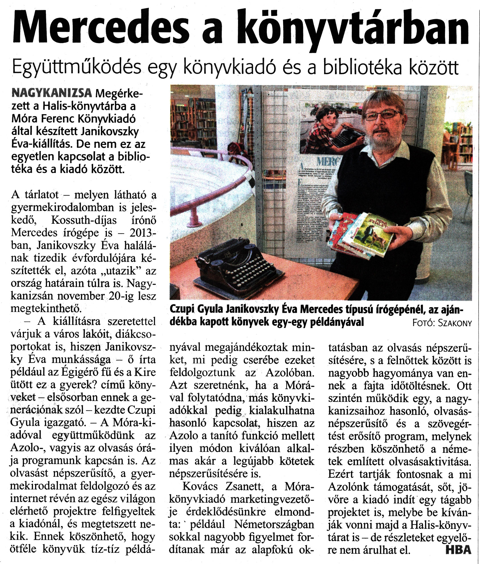 Nyilvános 1264 | 1809 | Zalai Hírlap 2020. október 21. 247. szám 3. oldal | Mercedes a könyvtárban Együttműködés egy könyvkiadó és a bibliotéka között NAGYKANIZSA Megérkezett a Halis-könyvtárba a Móra Ferenc Könyvkiadó által készített Janikovszky Éva-kiállítás. De nem ez az egyetlen kapcsolat a bibliotéka és a kiadó között. A tárlatot - melyen látható a gyermekirodalomban is jeleskedő, Kossuth-díjas írónő Mercedes írógépe is - 2013-ban, Janikovszky Éva halálának tizedik évfordulójára készítették el, azóta „utazik" az ország határain túlra is. Nagykanizsán november 20-ig lesz megtekinthető. - A kiállításra szeretettel várjuk a város lakóit, diákcsoportokat is, hiszen Janikovszky Éva munkássága - ő írta például az Égigérő fű és a Kire ütött ez a gyerek? című könyveket - elsősorban ennek a generációnak szól - kezdte Czupi Gyula igazgató. - A Móra-kiadóval együttműködünk az Azolo-, vagyis az olvasás órája programunk kapcsán is. Az olvasást népszerűsítő, a gyermekirodalmat feldolgozó és az internet révén az egész világon elérhető projektre felfigyeltek a kiadónál, és megtetszett nekik. Ennek köszönhető, hogy ötféle könyvük tíz-tíz példányával megajándékoztak minket, mi pedig cserébe ezeket feldolgoztunk az Azolóban. Azt szeretnénk, ha a Mórával folytatódna, más könyvkiadókkal pedig kialakulhatna hasonló kapcsolat, hiszen az Azolo a tanító funkció mellett ilyen módon kiválóan alkalmas akár a legújabb kötetek népszerűsítésére is. Kovács Zsanett, a Mórakönyvkiadó marketingvezetője érdeklődésünkre elmondta: \' például Németországban sokkal nagyobb figyelmet fordítanak már az alapfokú oktatásban az olvasás népszerűsítésére, s a felnőttek között is nagyobb hagyománya van ennek a fajta időtöltésnek. Ott szintén működik egy, a nagykanizsaihoz hasonló, olvasásnépszerűsítő és a szövegértést erősítő program, melynek részben köszönhető a németek említett olvasásaktivitása. Ezért tartják fontosnak a mi Azolónk támogatását, sőt, jövőre a kiadó indít egy tágabb projektet is, melybe be kívánják vonni majd a Halis-könyvtárat is - de részleteket egyelőre nem árulhat el. HBA Czupi Gyula Janikovszky Éva Mercedes típusú írógépénél, az ajándékba kapott könyvek egy-egy példányával Fotó: Szakony |
