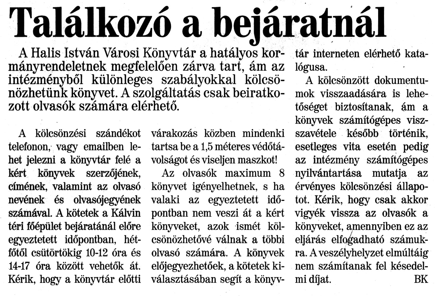 Nyilvános 1294 | 1669 | Nagykanizsai Maraton 2020. november 20. 45. szám 2. oldal | Találkozó a bejáratnál A Halis István Városi Könyvtár a hatályos kormányrendeletnek megfelelően zárva tart, ám az intézményből különleges szabályokkal kölcsönözhetünk könyvet. A szolgáltatás csak beiratkozott olvasók számára elérhető. A kölcsönzési szándékot telefonon, vagy emailben lehet jelezni a könyvtár felé a kért könyvek szerzőjének, címének, valamint az olvasó nevének és olvasójegyének számával. A kötetek a Kálvin téri főépület bejáratánál előre egyeztetett időpontban, hétfőtől csütörtökig 10-12 óra és 14-17 óra között vehetők át. Kérik, hogy a könyvtár előtti várakozás közben mindenki tartsa be a 1,5 méteres védőtávolságot és viseljen maszkot! Az olvasók maximum 8 könyvet igényelhetnek, s ha valaki az egyeztetett időpontban nem veszi át a kért könyveket, azok ismét kölcsönözhetővé válnak a többi olvasó számára. A könyvek előjegyezhetőek, a kötetek kiválasztásában segít a könyvtár interneten elérhető katalógusa. A kölcsönzött dokumentumok visszaadására is lehetőséget biztosítanak, ám a könyvek számítógépes visszavétele később történik, esetleges vita esetén pedig az intézmény számítógépes nyilvántartása mutatja az érvényes kölcsönzési állapotot. Kérik, hogy csak akkor vigyék vissza az olvasók a könyveket, amennyiben ez az eljárás elfogadható számukra. A veszélyhelyzet elmúltáig nem számítanak fel késedelmi díjat. BK |