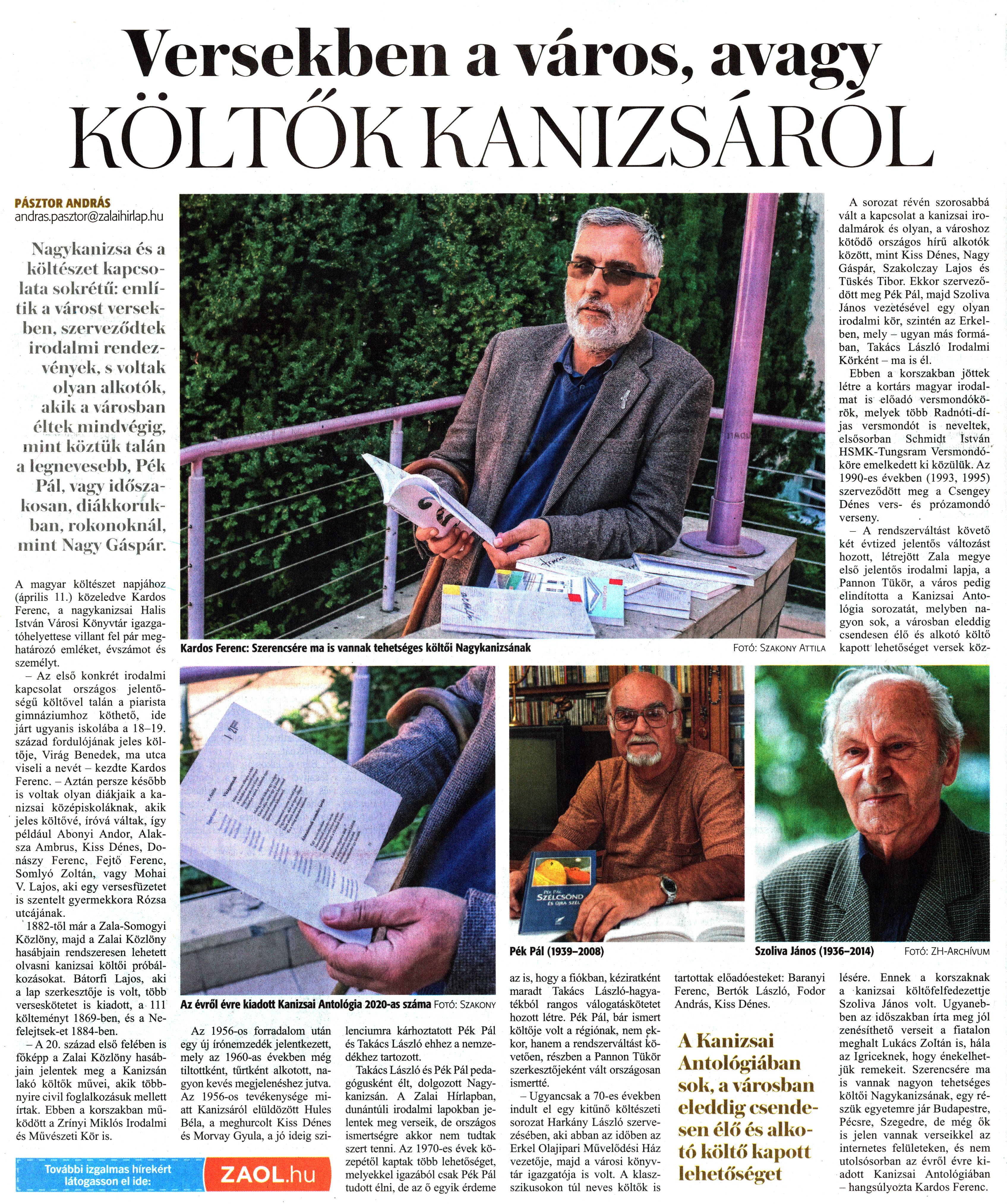 Nyilvános 1269 | 1738 | Zalai Hírlap 2021. április 10. 82. szám 9. oldal | Versekben a város, avagy KÖLTŐK KANIZSÁRÓL PÁSZTOR ANDRÁS andras.pasztor@zalaihirlap.hu Nagykanizsa és a költészet kapcsolata sokrétű: említik a várost versekben, szerveződtek irodalmi rendezvények, s voltak olyan alkotók, akik a városban éltek mindvégig, mint köztük talán a legnevesebb, Pék Pál, vagy időszakosan, diákkorukban, rokonoknál, mint Nagy Gáspár. A magyar költészet napjához (április 11.) közeledve Kardos Ferenc, a nagykanizsai Halis István Városi Könyvtár igazgatóhelyettese villant fel pár meghatározó emléket, évszámot és személyt. - Az első konkrét irodalmi kapcsolat országos jelentőségű költővel talán a piarista gimnáziumhoz köthető, ide járt ugyanis iskolába a 18-19. század fordulójának jeles költője, Virág Benedek, ma utca viseli a nevét - kezdte Kardos Ferenc. - Aztán persze később is voltak olyan diákjaik a kanizsai középiskoláknak, akik jeles költővé, íróvá váltak, így például Abonyi Andor, Alaksza Ambrus, Kiss Dénes, Donászy Ferenc, Fejtő Ferenc, Somlyó Zoltán, vagy Mohai V. Lajos, aki egy versesfüzetet is szentelt gyermekkora Rózsa utcájának. 1882-től már a Zala-Somogyi Közlöny, majd a Zalai Közlöny hasábjain rendszeresen lehetett olvasni kanizsai költői próbálkozásokat. Bátorfi Lajos, aki a lap szerkesztője is volt, több verseskötetet is kiadott, a 111 költeményt 1869-ben, és a Nefelejtsek-et 1884-ben. - A 20. század első felében is főképp a Zalai Közlöny hasábjain jelentek meg a Kanizsán lakó költők müvei, akik többnyire civil foglalkozásuk mellett írtak. Ebben a korszakban működött a Zrínyi Miklós Irodalmi és Művészeti Kör is. Az 1956-os forradalom után egy új írónemzedék jelentkezett, mely az 1960-as években még tiltottként, tűrtként alkotott, nagyon kevés megjelenéshez jutva. Az 1956-os tevékenysége miatt Kanizsáról elüldözött Hules Béla, a meghurcolt Kiss Dénes és Morvay Gyula, a jó ideig szilenciumra kárhoztatott Pék Pál és Takács László ehhez a nemzedékhez tartozott. Takács László és Pék Pál pedagógusként élt, dolgozott Nagykanizsán. A Zalai Hírlapban, dunántúli irodalmi lapokban jelentek meg verseik, de országos ismertségre akkor nem tudtak szert tenni. Az 1970-es évek közepétől kaptak több lehetőséget, melyekkel igazából csak Pék Pál tudott élni, de az ő egyik érdeme az is, hogy a fiókban, kéziratként maradt Takács László-hagyatékból rangos válogatáskötetet hozott létre. Pék Pál, bár ismert költője volt a régiónak, nem ekkor, hanem a rendszerváltást követően, részben a Pannon Tükör szerkesztőjeként vált országosan ismertté. - Ugyancsak a 70-es években indult el egy kitűnő költészeti sorozat Harkány László szervezésében, aki abban az időben az Erkel Olajipari Művelődési Ház vezetője, majd a városi könyvtár igazgatója is volt. A klasz-szikusokon túl neves költők is tartottak előadóesteket: Bárányi Ferenc, Bertók László, Fodor András, Kiss Dénes. A Kanizsai Antológiában sok, a városban eleddig'' csendesen élő és alkotó költő kapott lehetőséget A sorozat révén szorosabbá vált a kapcsolat a kanizsai irodalmárok és olyan, a városhoz kötődő országos hírű alkotók között, mint Kiss Dénes, Nagy Gáspár, Szakolczay Lajos és Tüskés Tibor. Ekkor szerveződött meg Pék Pál, majd Szoliva János vezetésével egy olyan irodalmi kör, szintén az Erkelben, mely - ugyan más formában, Takács László Irodalmi Körként - ma is él. Ebben a korszakban jöttek létre a kortárs magyar irodalmat is előadó versmondókörök, melyek több Radnóti-díjas versmondót is neveltek, elsősorban Schmidt István HSMK-Tungsram Versmondóköre emelkedett ki közülük. Az 1990-es években (1993, 1995) szerveződött meg a Csengey Dénes vers- és prózamondó verseny. - A rendszerváltást követő két évtized jelentős változást hozott, létrejött Zala megye első jelentős irodalmi lapja, a Pannon Tükör, a város pedig elindította a Kanizsai Antológia sorozatát, melyben nagyon sok, a városban eleddig csendesen élő és alkotó költő kapott lehetőséget versek közlésére. Ennek a korszaknak a kanizsai költőfelfedezettje Szoliva János volt. Ugyanebben az időszakban írta meg jól zenésíthető verseit a fiatalon meghalt Lukács Zoltán is, hála az Igriceknek, hogy énekelhetjük remekeit. Szerencsére ma is vannak nagyon tehetséges költői Nagykanizsának, egy részük egyetemre jár Budapestre, Pécsre, Szegedre, de még ők is jelen vannak verseikkel az internetes felületeken, és nem utolsósorban az évről évre kiadott Kanizsai Antológiában - hangsúlyozta Kardos Ferenc. Szoliva János (1936-2014) Fotó: ZH-Archívum Kardos Ferenc: Szerencsére ma is vannak tehetséges költői Nagykanizsának Fotó: Szakony Attila Az évről évre kiadott Kanizsai Antológia 2020-as száma Fotó: Szakony |