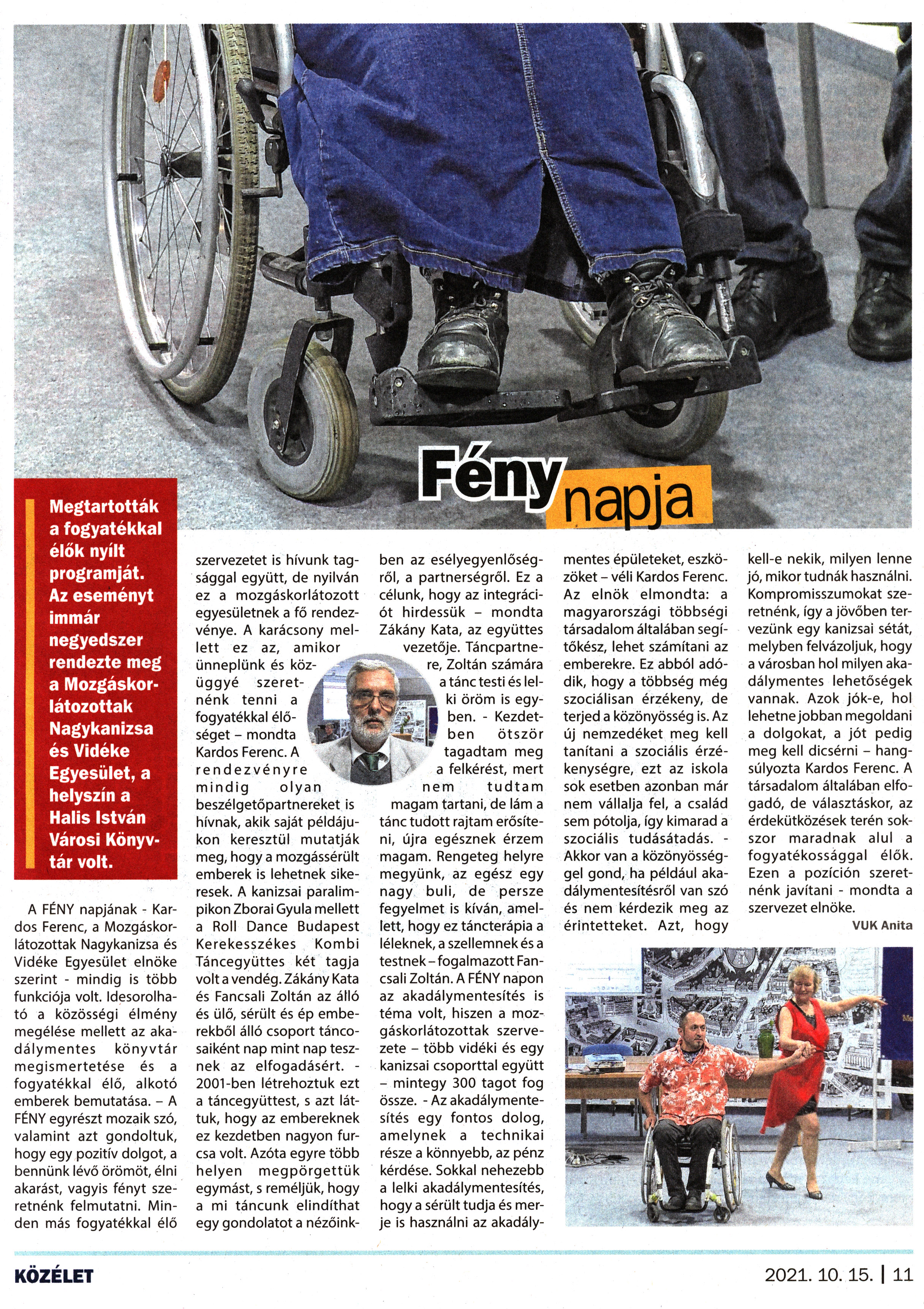 Nyilvános 1252 | 1810 | Kanizsa 2021. október 15. 18. szám 11. oldal | Fény napja Megtartották a fogyatékkal élők nyílt programját. Az eseményt immár negyedszer rendezte meg a Mozgáskorlátozottak Nagykanizsa és Vidéke Egyesület, a helyszín a Halis István Városi Könyvtár volt. A FÉNY napjának - Kardos Ferenc, a Mozgáskorlátozottak Nagykanizsa és Vidéke Egyesület elnöke szerint - mindig is több funkciója volt. Idesorolható a közösségi élmény megélése mellett az akadálymentes könyvtár megismertetése és a fogyatékkal élő, alkotó emberek bemutatása. - A FÉNY egyrészt mozaik szó, valamint azt gondoltuk, hogy egy pozitív dolgot, a bennünk lévő örömöt, élni akarást, vagyis fényt szeretnénk felmutatni. Minden más fogyatékkal élő szervezetet is hívunk tagsággal együtt, de nyilván ez a mozgáskorlátozott egyesületnek a fő rendezvénye. A karácsony mellett ez az, amikor ünneplünk és közüggyé szeretnénk tenni a fogyatékkal élőséget - mondta Kardos Ferenc. A rendezvényre mindig olyan beszélgetőpartnereket is hívnak, akik saját példájukon keresztül mutatják meg, hogy a mozgássérült emberek is lehetnek sikeresek. A kanizsai paralimpikon Zborai Gyula mellett a Roll Dance Budapest Kerekesszékes Kombi Táncegyüttes két tagja volt a vendég. Zákány Kata és Fancsali Zoltán az álló és ülő, sérült és ép emberekből álló csoport táncosaiként nap mint nap tesznek az elfogadásért. -2001-ben létrehoztuk ezt a táncegyüttest, s azt láttuk, hogy az embereknek ez kezdetben nagyon furcsa volt. Azóta egyre több helyen megpörgettük egymást, s reméljük, hogy a mi táncunk elindíthat egy gondolatot a nézőinkben az esélyegyenlőségről, a partnerségről. Ez a célunk, hogy az integrációt hirdessük - mondta Zákány Kata, az együttes vezetője. Táncpartnere, Zoltán számára a tánc testi és lelki öröm is egyben. - Kezdetben ötször tagadtam meg a felkérést, mert nem tudtam magam tartani, de lám a tánc tudott rajtam erősíteni, újra egésznek érzem magam. Rengeteg helyre megyünk, az egész egy nagy buli, de persze fegyelmet is kíván, amellett, hogy ez táncterápia a léleknek, a szellemnek és a testnek-fogalmazott Fancsali Zoltán. A FÉNY napon az akadálymentesítés is téma volt, hiszen a mozgáskorlátozottak szervezete - több vidéki és egy kanizsai csoporttal együtt - mintegy 300 tagot fog össze. - Az akadálymentesítés egy fontos dolog, amelynek a technikai része a könnyebb, az pénz kérdése. Sokkal nehezebb a lelki akadálymentesítés, hogy a sérült tudja és merje is használni az akadálymentes épületeket, eszközöket - véli Kardos Ferenc. Az elnök elmondta: a magyarországi többségi társadalom általában segítőkész, lehet számítani az emberekre. Ez abból adódik, hogy a többség még szociálisan érzékeny, de terjed a közönyösség is. Az új nemzedéket meg kell tanítani a szociális érzékenységre, ezt az iskola sok esetben azonban már nem vállalja fel, a család sem pótolja, így kimarad a szociális tudásátadás. - Akkor van a közönyösséggel gond, ha például akadálymentesítésről van szó és nem kérdezik meg az érintetteket. Azt, hogy kell-e nekik, milyen lenne jó, mikor tudnák használni. Kompromisszumokat szeretnénk, így a jövőben tervezünk egy kanizsai sétát, melyben felvázoljuk, hogy a városban hol milyen akadálymentes lehetőségek vannak. Azok jók-e, hol lehetne jobban megoldani a dolgokat, a jót pedig meg kell dicsérni - hangsúlyozta Kardos Ferenc. A társadalom általában elfogadó, de választáskor, az érdekütközések terén sokszor maradnak alul a fogyatékossággal élők. Ezen a pozíción szeretnénk javítani - mondta a szervezet elnöke. VUK Anita |