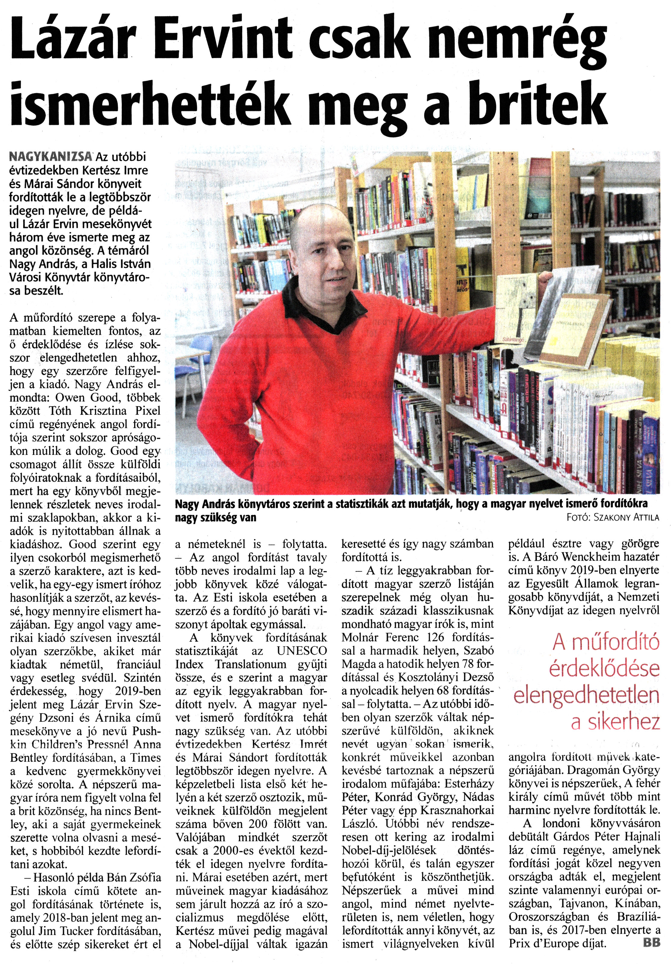 Nyilvános 1153 | 1610 | Zalai Hírlap 2022. február 9. 33. szám 12. oldal | Lázár Ervint csak nemrég ismerhették meg a britek NAGYKANIZSA Az utóbbi évtizedekben Kertész Imre és Márai Sándor könyveit fordították le a legtöbbször idegen nyelvre, de például Lázár Ervin mesekönyvét három éve ismerte meg az angol közönség. A témáról Nagy András, a Halis István Városi Könyvtár könyvtárosa beszélt. A műfordító szerepe a folyamatban kiemelten fontos, az ő érdeklődése és ízlése sokszor elengedhetetlen ahhoz, hogy egy szerzőre felfigyeljen a kiadó. Nagy András elmondta: Owen Good, többek között Tóth Krisztina Pixel című regényének angol fordítója szerint sokszor apróságokon múlik a dolog. Good egy csomagot állít össze külföldi folyóiratoknak a fordításaiból, mert ha egy könyvből megjelennek részletek neves irodalmi szaklapokban, akkor a kiadók is nyitottabban állnak a kiadáshoz. Good szerint egy ilyen csokorból megismerhető a szerző karaktere, azt is kedvelik, ha egy-egy ismert íróhoz hasonlítják a szerzőt, az kevéssé, hogy mennyire elismert hazájában. Egy angol vagy amerikai kiadó szívesen invesztál olyan szerzőkbe, akiket már kiadtak németül, franciául vagy esetleg svédül. Szintén érdekesség, hogy 2019-ben jelent meg Lázár Ervin Szegény Dzsoni és Árnika című mesekönyve a jó nevű Push-kin Children''s Pressnél Anna Bentley fordításában, a Times a kedvenc gyermekkönyvei közé sorolta. A népszerű magyar íróra nem figyelt volna fel a brit közönség, ha nincs Bentley, aki a saját gyermekeinek szerette volna olvasni a meséket, s hobbiból kezdte lefordítani azokat. - Hasonló példa Bán Zsófia Esti iskola című kötete angol fordításának története is, amely 2018-ban jelent meg angolul Jim Tucker fordításában, és előtte szép sikereket ért el a németeknél is - folytatta. - Az angol fordítást tavaly több neves irodalmi lap a legjobb könyvek közé válogatta. Az Esti iskola esetében a szerző és a fordító jó baráti viszonyt ápoltak egymással. A könyvek fordításának statisztikáját az UNESCO Index Translationum gyűjti Össze, és e szerint a magyar az egyik leggyakrabban fordított nyelv. A magyar nyelvet ismerő fordítókra tehát nagy szükség van. Az utóbbi évtizedekben Kertész Imrét és Márai Sándort fordították legtöbbször idegen nyelvre. A képzeletbeli lista első két helyén a két szerző osztozik, műveiknek külföldön megjelent száma bőven 200 fölött van. Valójában mindkét szerzőt csak a 2000-es évektől kezdték el idegen nyelvre fordítani. Márai esetében azért, mert műveinek magyar kiadásához sem járult hozzá az író a szocializmus megdőlése előtt, Kertész művei pedig magával a Nobel-díjjal váltak igazán keresetté és így nagy számban fordítottá is. - A tíz leggyakrabban fordított magyar szerző listáján szerepelnek még olyan huszadik századi klasszikusnak mondható magyar írók is, mint Molnár Ferenc 126 fordítással a harmadik helyen, Szabó Magda a hatodik helyen 78 fordítással és Kosztolányi Dezső a nyolcadik helyen 68 fordítással - folytatta. - Az utóbbi időben olyan szerzők váltak népszerűvé külföldön, akiknek nevét ugyan sokan ismerik, konkrét műveikkel azonban kevésbé tartoznak a népszerű irodalom műfajába: Esterházy Péter, Konrád György, Nádas Péter vagy épp Krasznahorkai László. Utóbbi név rendszeresen ott kering az irodalmi Nobel-díj-jelölések döntéshozói körül, és talán egyszer befutóként is köszönthetjük. Népszerűek a művei mind angol, mind német nyelvterületen is, nem véletlen, hogy lefordították annyi könyvét, az ismert világnyelveken kívül például észtre vagy görögre is. A Báró Wenckheim hazatér című könyv 2019-ben elnyerte az Egyesült Államok legrangosabb könyvdíját, a Nemzeti Könyvdíjat az idegen nyelvről angolra fordított müvek kategóriájában. Dragomán György könyvei is népszerűek, A fehér király című művét több mint harminc nyelvre fordították le. A londoni könyvvásáron debütált Gárdos Péter Hajnali láz című regénye, amelynek fordítási jogát közel negyven országba adták el, megjelent szinte valamennyi európai országban, Tajvanon, Kínában, Oroszországban és Brazíliában is, és 2017-ben elnyerte a Prix d''Europe díjat. BB Nagy András könyvtáros szerint a statisztikák azt mutatják, hogy a magyar nyelvet ismerő fordítókra nagy szükség van Fotó: Szakony Attila |