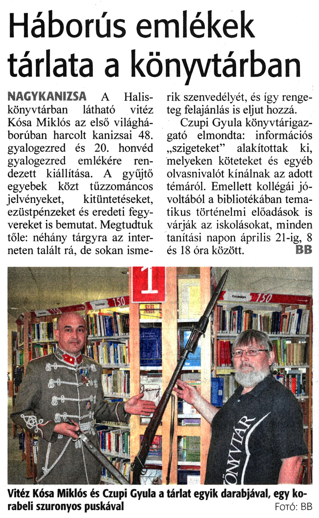 Nyilvános 1136 | 1635 | Zalai Hírlap 2022. március 23. 68. szám 20. oldal | Háborús emlékek tárlata a könyvtárban NAGYKANIZSA A Halis-könyvtárban látható vitéz Kósa Miklós az első világháborúban harcolt kanizsai 48. gyalogezred és 20. honvéd gyalogezred emlékére rendezett kiállítása. A gyűjtő egyebek közt tűzzománcos jelvényeket, kitüntetéseket, ezüstpénzeket és eredeti fegyvereket is bemutat. Megtudtuk tőle: néhány tárgyra az interneten talált rá, de sokan ismerik szenvedélyét, és így rengeteg felajánlás is eljut hozzá. Czupi Gyula könyvtárigazgató elmondta: információs „szigeteket" alakítottak ki, melyeken köteteket és egyéb olvasnivalót kínálnak az adott témáról. Emellett kollégái jóvoltából a bibliotékában tematikus történelmi előadások is várják az iskolásokat, minden tanítási napon április 21-ig, 8 és 18 óra között. BB Vitéz Kósa Miklós és Czupi Gyula a tárlat egyik darabjával, egy korabeli szuronyos puskával Fotó: BE |