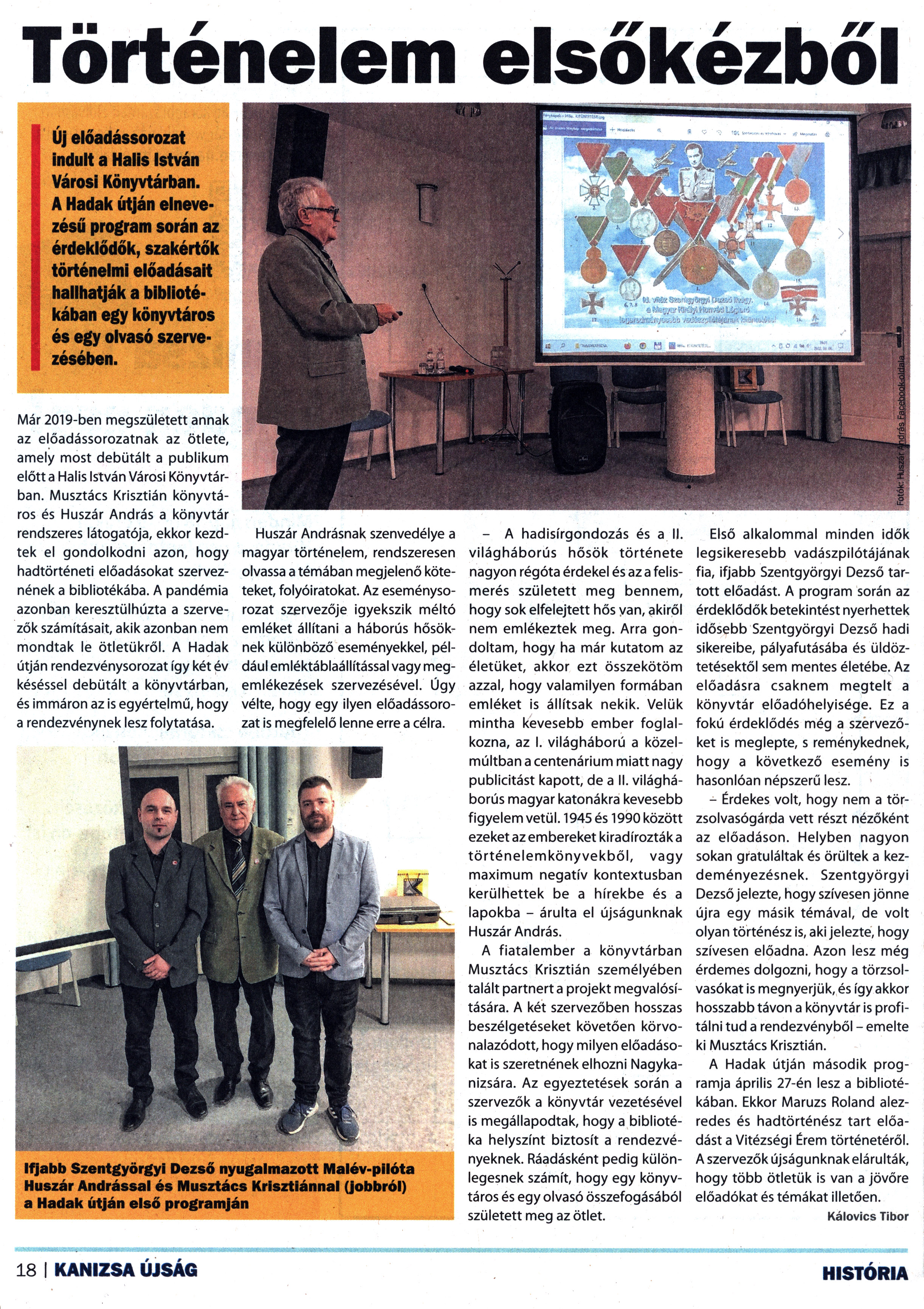 Nyilvános 1277 | 1643 | Kanizsa 2022. április 22. 8. szám 18. oldal | Történelem elsőkézből Új előadássorozat indult a Halis István Városi Könyvtárban. A Hadak útján elnevezésű program során az érdeklődők, szakértők történelmi előadásait hallhatják a bibliotékában egy könyvtáros és egy olvasó szervezésében. Már 2019-ben megszületett annak az előadássorozatnak az ötlete, amely most debütált a publikum előtt a Halis István Városi Könyvtárban. Musztács Krisztián könyvtáros és Huszár András a könyvtár rendszeres látogatója, ekkor kezdtek el gondolkodni azon, hogy hadtörténeti előadásokat szerveznének a bibliotékába. A pandémia azonban keresztülhúzta a szervezők számításait, akik azonban nem mondtak le ötletükről. A Hadak útján rendezvénysorozat így két év késéssel debütált a könyvtárban, és immáron az is egyértelmű, hogy a rendezvénynek lesz folytatása. Huszár Andrásnak szenvedélye a magyar történelem, rendszeresen olvassa a témában megjelenő köteteket, folyóiratokat. Az eseménysorozat szervezője igyekszik méltó emléket állítani a háborús hősöknek különböző eseményekkel, például emléktáblaállítással vagy megemlékezések szervezésével. Úgy vélte, hogy egy ilyen előadássorozat is megfelelő lenne erre a célra. - A hadisírgondozás és a II. világháborús hősök története nagyon régóta érdekel és az a felismerés született meg bennem, hogy sok elfelejtett hős van, akiről nem emlékeztek meg. Arra gondoltam, hogy ha már kutatom az életüket, akkor ezt összekötöm azzal, hogy valamilyen formában emléket is állítsak nekik. Velük mintha kevesebb ember foglalkozna, az I. világháború a közelmúltban a centenárium miatt nagy publicitást kapott, de a II. világháborús magyar katonákra kevesebb figyelem vetül. 1945és 1990 között ezeket az embereket kiradírozták a történelemkönyvekből, vagy maximum negatív kontextusban kerülhettek be a hírekbe és a lapokba - árulta el újságunknak Huszár András. A fiatalember a könyvtárban Musztács Krisztián személyében talált partnert a projekt megvalósítására. A két szervezőben hosszas beszélgetéseket követően körvonalazódott, hogy milyen előadásokat is szeretnének elhozni Nagykanizsára. Az egyeztetések során a szervezők a könyvtár vezetésével is megállapodtak, hogy a bibliotéka helyszínt biztosít a rendezvényeknek. Ráadásként pedig különlegesnek számít, hogy egy könyvtáros és egy olvasó összefogásából született meg az ötlet. Első alkalommal minden idők legsikeresebb vadászpilótájának fia, ifjabb Szentgyörgyi Dezső tartott előadást. A program során az érdeklődők betekintést nyerhettek idősebb Szentgyörgyi Dezső hadi sikereibe, pályafutásába és üldöztetésektől sem mentes életébe. Az előadásra csaknem megtelt a könyvtár előadóhelyisége. Ez a fokú érdeklődés még a szervezőket is meglepte, s reménykednek, hogy a következő esemény is hasonlóan népszerű lesz. - Érdekes volt, hogy nem a törzsolvasógárda vett részt nézőként az előadáson. Helyben nagyon sokan gratuláltak és örültek a kezdeményezésnek. Szentgyörgyi Dezső jelezte, hogy szívesen jönne újra egy másik témával, de volt olyan történész is, aki jelezte, hogy szívesen előadna. Azon lesz még érdemes dolgozni, hogy a törzsolvasókat is megnyerjük, és így akkor hosszabb távon a könyvtár is profitálni tud a rendezvényből - emelte ki Musztács Krisztián. A Hadak útján második programja április 27-én lesz a bibliotékában. Ekkor Maruzs Roland alezredes és hadtörténész tart előadást a Vitézségi Érem történetéről. A szervezők újságunknak elárulták, hogy több ötletük is van a jövőre előadókat és témákat illetően. Kálovics Tibor Ifjabb Szentgyörgyi Dezső nyugalmazott Malév-pilóta Huszár Andrással és Musztács Krisztiánnal (jobbról) a Hadak útján első programján |