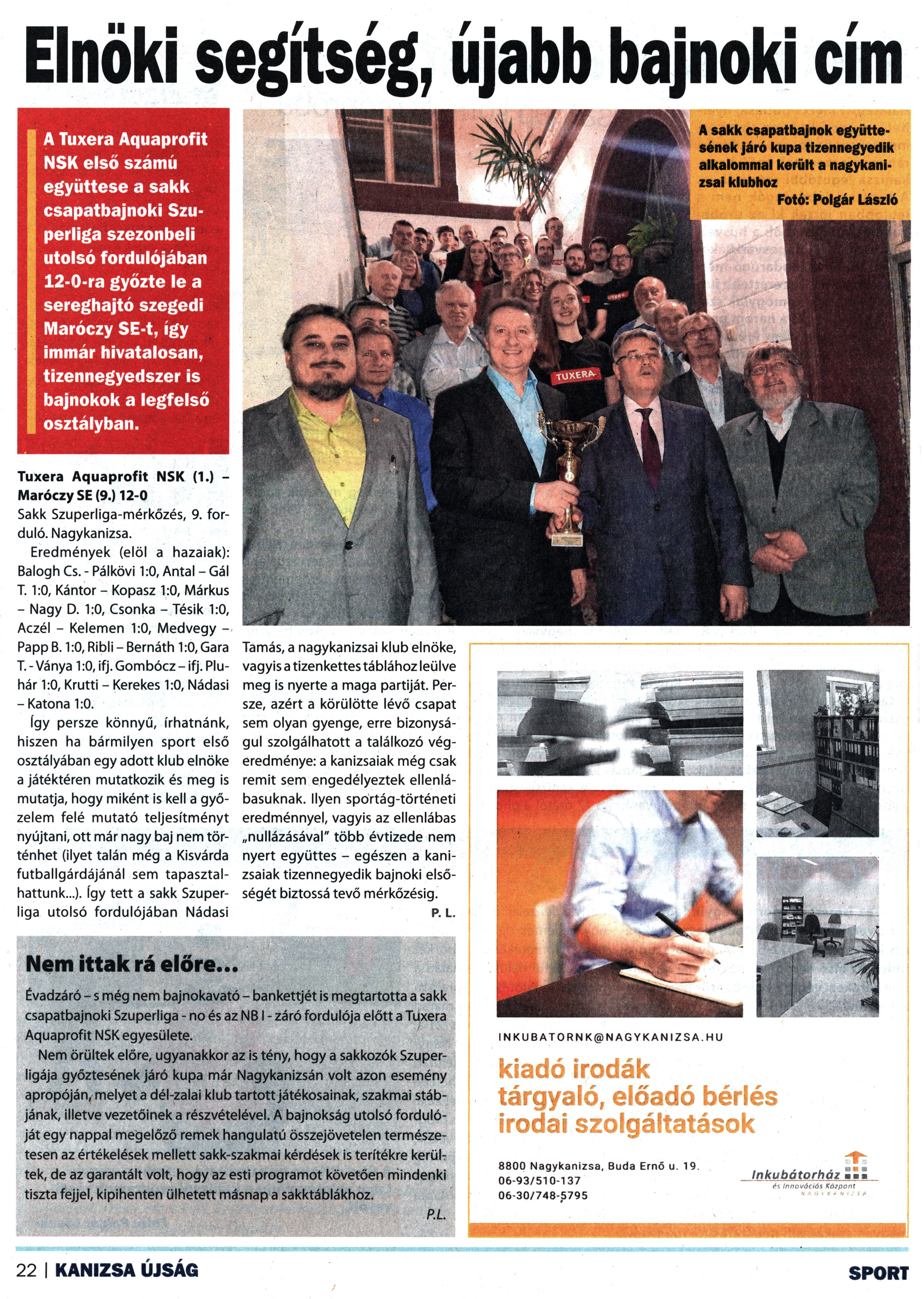Nyilvános 1222 | 1534 | Kanizsa 2022. április 22. 8. szám 22. oldal | A Tuxera Aquaprofit NSK első számú együttese a sakk csapatbajnoki Szuperliga szezonbeli utolsó fordulójában 12-0-ra győzte le a sereghajtó szegedi Maróczy SE-t, így immár hivatalosan, tizennegyedszer is bajnokok a legfelső osztályban. 19. Elnöki segítség, újabb bajnoki cím Nem ittak rá előre... Tuxera Aquaprofit NSK (1.) -Maróczy SE (9.) 12-0 Sakk Szuperliga-mérkőzés, 9. forduló. Nagykanizsa. Eredmények (elöl a hazaiak): Balogh Cs. - Pálkövi 1:0, Antal - Gál T. 1:0, Kántor - Kopasz 1:0, Márkus - Nagy D. 1:0, Csonka - Tésik 1:0, Aczél - Kelemen 1:0, Medvegy -Papp B. 1:0, Ribli - Bernáth 1:0, Gara T. - Ványa 1:0, ifj. Gombócz - ifj. Plu-hár 1:0, Krutti - Kerekes 1:0, Nádasi -Katona 1:0. így persze könnyű, írhatnánk, hiszen ha bármilyen sport első osztályában egy adott klub elnöke a játéktéren mutatkozik és meg is mutatja, hogy miként is kell a győzelem felé mutató teljesítményt nyújtani, ott már nagy baj nem történhet (ilyet talán még a Kisvárda futballgárdájánál sem tapasztalhattunk...). így tett a sakk Szuperliga utolsó fordulójában Nádasi Tamás, a nagykanizsai klub elnöke, vagyis a tizenkettes táblához leülve meg is nyerte a maga partiját. Persze, azért a körülötte lévő csapat sem olyan gyenge, erre bizonyságul szolgálhatott a találkozó végeredménye: a kanizsaiak még csak remit sem engedélyeztek ellenlábasuknak. Ilyen sportág-történeti eredménnyel, vagyis az ellenlábas „nullázásával" több évtizede nem nyert együttes - egészen a kanizsaiak tizennegyedik bajnoki elsőségét biztossá tevő mérkőzésig. P. L. Évadzáró - s még nem bajnokavató - bankettjét is megtartotta a sakk csapatbajnoki Szuperliga - no és az NBI - záró fordulója előtt a Tuxera Aquaprofit NSK egyesülete. Nem örültek előre, ugyanakkor az is tény, hogy a sakkozók Szuperligája győztesének járó kupa már Nagykanizsán volt azon esemény apropóján, melyet a dél-zalai klub tartott játékosainak, szakmai stábjának, illetve vezetőinek a részvételével. A bajnokság utolsó fordulóját egy nappal megelőző remek hangulatú összejövetelen természetesen az értékelések mellett sakk-szakmai kérdések is terítékre került tek, de az garantált volt, hogy az esti programot követően mindenki tiszta fejjel, kipihenten ülhetett másnapa sakktáblákhoz. Pl. A sakk csapatbajnok együttesének járó kupa tizennegyedik alkalommal került a nagykanizsai klubhoz Fotó: Polgár László |