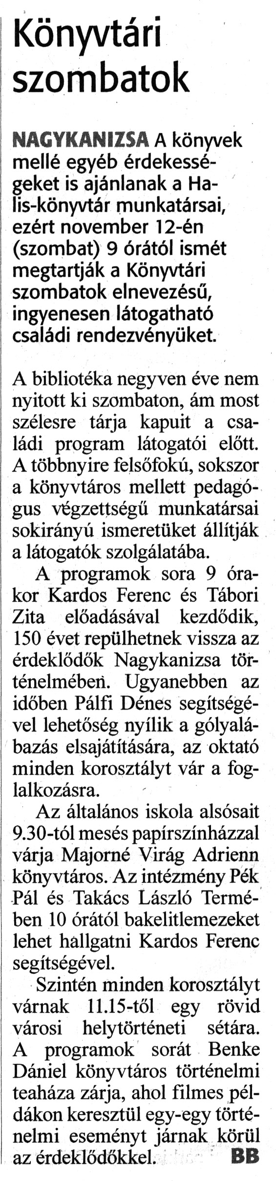 Nyilvános 1101 | 1440 | Zalai Hírlap 2022. november 11. 263. szám 4. oldal | Könyvtári szombatok NAGYKANIZSA A könyvek mellé egyéb érdekességeket is ajánlanak a Halis-könyvtár munkatársai, ezért november 12-én (szombat) 9 órától ismét megtartják a Könyvtári szombatok elnevezésű, ingyenesen látogatható családi rendezvényüket. A bibliotéka negyven éve nem nyitott ki szombaton, ám most szélesre tárja kapuit a családi program látogatói előtt. A többnyire felsőfokú, sokszor a könyvtáros mellett pedagógus végzettségű munkatársai sokirányú ismeretüket állítják a látogatók szolgálatába. A programok sora 9 órakor Kardos Ferenc és Tábori Zita előadásával kezdődik, 150 évet repülhetnek vissza az érdeklődők Nagykanizsa történelmében. Ugyanebben az időben Pálfi Dénes segítségével lehetőség nyílik a gólyalábazás elsajátítására, az oktató minden korosztályt vár a foglalkozásra. Az általános iskola alsósait 9.30-tól mesés papírszínházzal várja Majomé Virág Adrienn könyvtáros. Az intézmény Pék Pál és Takács László Termében 10 órától bakelitlemezeket lehet hallgatni Kardos Ferenc segítségével. Szintén minden korosztályt várnak 11.15-től egy rövid városi helytörténeti sétára. A programok sorát Benke Dániel könyvtáros történelmi teaháza zárja, ahol filmes példákon keresztül egy-egy történelmi eseményt járnak körül az érdeklődőkkel. BB |