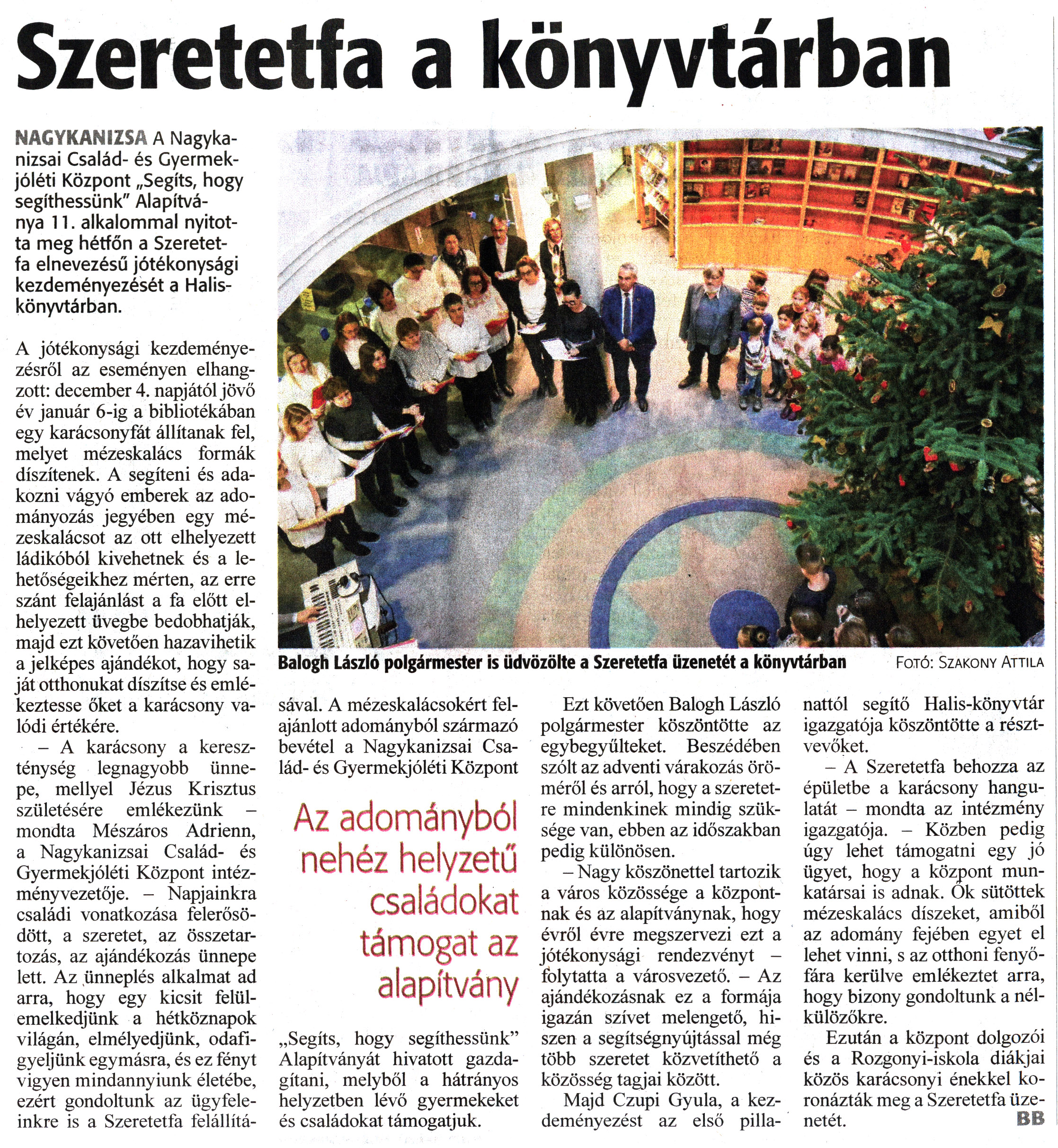 Nyilvános 1002 | 1475 | Zalai Hírlap 2023. december 5. 283. szám 2. oldal | Szeretetfa a könyvtárban Balogh László polgármester is üdvözölte a Szeretetfa üzenetét a könyvtárban Fotó: Szakony Attila NAGYKANIZSA A Nagykanizsai Család- és Gyermekjóléti Központ „Segíts, hogy segíthessünk" Alapítványa 11. alkalommal nyitotta meg hétfőn a Szeretetfa elnevezésű jótékonysági kezdeményezését a Halis-könyvtárban. A jótékonysági kezdeményezésről az eseményen elhangzott: december 4. napjától jövő év január 6-ig a bibliotékában egy karácsonyfát állítanak fel, melyet mézeskalács formák díszítenek. A segíteni és adakozni vágyó emberek az adományozás jegyében egy mézeskalácsot az ott elhelyezett ládikóból kivehetnek és a lehetőségeikhez mérten, az erre szánt felajánlást a fa előtt elhelyezett üvegbe bedobhatják, majd ezt követően hazavihetik a jelképes ajándékot, hogy saját otthonukat díszítse és emlékeztesse őket a karácsony valódi értékére. - A karácsony a kereszténység legnagyobb ünnepe, mellyel Jézus Krisztus születésére emlékezünk -mondta Mészáros Adrienn, a Nagykanizsai Család- és Gyermekjóléti Központ intézményvezetője. - Napjainkra családi vonatkozása felerősödött, a szeretet, az összetartozás, az ajándékozás ünnepe lett. Az ünneplés alkalmat ad arra, hogy egy kicsit felülemelkedjünk a hétköznapok világán, elmélyedjünk, odafigyeljünk egymásra, és ez fényt vigyen mindannyiunk életébe, ezért gondoltunk az ügyfeleinkre is a Szeretetfa felállításával. A mézeskalácsokért felajánlott adományból származó bevétel a Nagykanizsai Család- és Gyermekjóléti Központ „Segíts, hogy segíthessünk" Alapítványát hivatott gazdagítani, melyből a hátrányos helyzetben lévő gyermekeket és családokat támogatjuk. Ezt követően Balogh László polgármester köszöntötte az egybegyűlteket. Beszédében szólt az adventi várakozás öröméről és arról, hogy a szeretetre mindenkinek mindig szüksége van, ebben az időszakban pedig különösen. - Nagy köszönettel tartozik a város közössége a központnak és az alapítványnak, hogy évről évre megszervezi ezt a jótékonysági rendezvényt -folytatta a városvezető. - Az ajándékozásnak ez a formája igazán szívet melengető, hiszen a segítségnyújtással még több szeretet közvetíthető a közösség tagjai között. Majd Czupi Gyula, a kezdeményezést az első pillanattól segítő Halis-könyvtár igazgatója köszöntötte a résztvevőket. - A Szeretetfa behozza az épületbe a karácsony hangulatát - mondta az intézmény igazgatója. - Közben pedig úgy lehet támogatni egy jó ügyet, hogy a központ munkatársai is adnak. Ők sütöttek mézeskalács díszeket, amiből az adomány fejében egyet el lehet vinni, s az otthoni fenyőfára kerülve emlékeztet arra, hogy bizony gondoltunk a nélkülözőkre. Ezután a központ dolgozói és a Rozgonyi-iskola diákjai közös karácsonyi énekkel koronázták meg a Szeretetfa üzenetét. " BB |