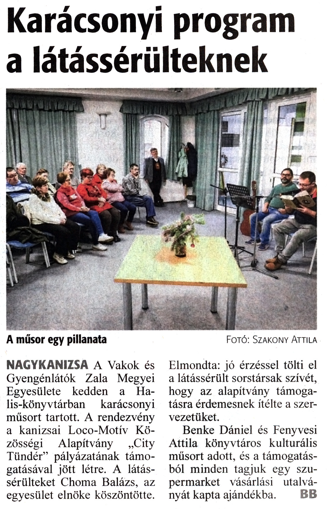 Nyilvános 1016 | 1355 | Zalai Hírlap 2023. december 13. 290. szám 1. oldal | Karácsonyi program a látássérülteknek A műsor egy pillanata Fotó: Szakony Attila NAGYKANIZSA A Vakok és Gyengénlátók Zala Megyei Egyesülete kedden a Halis-könyvtárban karácsonyi műsort tartott. A rendezvény a kanizsai Loco-Motív Közösségi Alapítvány „City Tündér" pályázatának támogatásával jött létre. A látássérülteket Choma Balázs, az egyesület elnöke köszöntötte. Elmondta: jó érzéssel tölti el a látássérült sorstársak szívét, hogy az alapítvány támogatásra érdemesnek ítélte a szervezetüket. Benke Dániel és Fenyvesi Attila könyvtáros kulturális műsort adott, és a támogatásból minden tagjuk egy szupermarket vásárlási utalványát kapta ajándékba. BB |