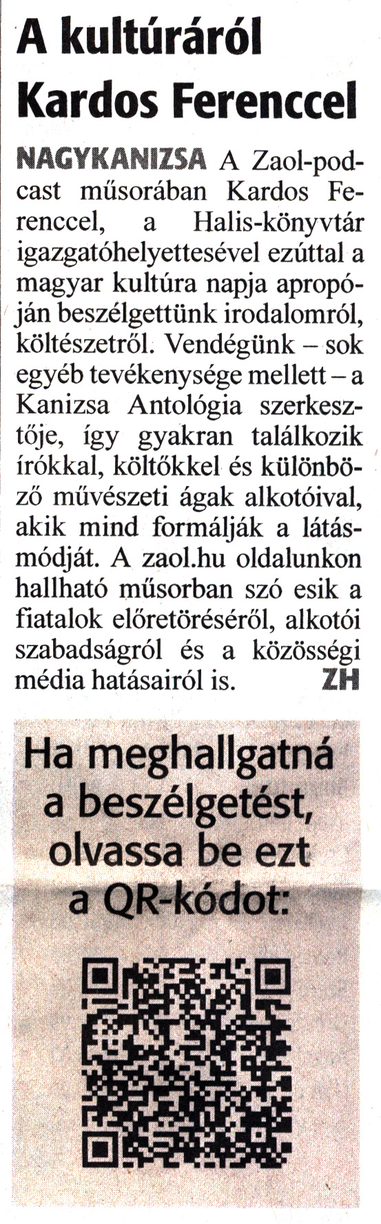 Nyilvános 997 | 1278 | Zalai Hírlap 2024. január 23. 19. szám 1. oldal | A kultúráról Kardos Ferenccel NAGYKANIZSA A Zaol-pod-cast műsorában Kardos Ferenccel, a Halis-könyvtár igazgatóhelyettesével ezúttal a magyar kultúra napja apropóján beszélgettünk irodalomról, költészetről. Vendégünk - sok egyéb tevékenysége mellett - a Kanizsa Antológia szerkesztője, így gyakran találkozik írókkal, költőkkel és különböző művészeti ágak alkotóival, akik mind formálják a látásmódját. A zaol.hu oldalunkon hallható műsorban szó esik a fiatalok előretöréséről, alkotói szabadságról és a közösségi média hatásairól is. ZH Ha meghallgatná a beszélgetést, olvassa be ezt a QR-kódot |