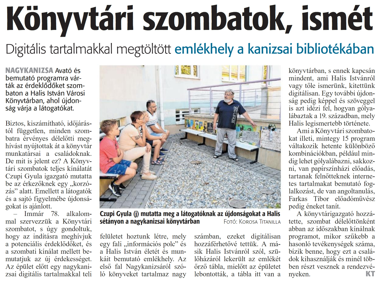Nyilvános 891 | 1171 | Zalai Hírlap 2024. szeptember 9. 210. szám 4. oldal | Könyvtári szombatok, ismét Digitális tartalmakkal megtöltött emlékhely a kanizsai bibliotékában NAGYKANIZSA Avató és bemutató programra várták az érdeklődőket szombaton a Halis István Városi Könyvtárban, ahol újdonság várja a látogatókat. Biztos, kiszámítható, időjárástól független, minden szombatra érvényes délelőtti meghívást nyújtottak át a könyvtár munkatársai a családoknak. De mit is jelent ez? A Könyvtári szombatok teljes kínálatát Czupi Gyula igazgató mutatta be az érkezőknek egy „korzózás" alatt. Emellett a látogatók és a sajtó figyelmébe újdonságokat is ajánlott. - Immár 78. alkalommal szervezzük a Könyvtári szombatot, s úgy gondoltuk, hogy az indításra meghívjuk a potenciális érdeklődőket, és a szombati kínálat mellett bemutatjuk az új érdekességet. Az épület előtt egy nagykanizsai digitális tartalmakkal teli felületet hoztunk létre, mely egy fali „információs polc" és a Halis István életét és munkáit bemutató emlékhely. Az első fal Nagykanizsáról szóló könyveket tartalmaz nagy számban, ezeket digitálisan hozzáférhetővé tettük. A másik Halis Istvánról szól, szülőházáról lekerült az emlékét őrző tábla, mielőtt az épületet lebontották, a tábla itt van a könyvtárban, s ennek kapcsán mindent, ami Halis Istvánról vagy tőle ismerünk, kitettünk digitálisan. Egy további újdonság pedig képpel és szöveggel is azt idézi fel, hogyan gólyalábaztak a 19. században, mely Halis legismertebb története. Ami a Könyvtári szombatokat illeti, mintegy 15 program váltakozik hetente különböző kombinációkban, például mindig lehet gólyalábazni, sakkozni, van papírszínházi előadás, tartanak felnőtteknek internetes tartalmakat bemutató foglalkozást, de van angoltanulás, Farkas Tibor előadóművész pedig éneket tanít. A könyvtárigazgató hozzátette, szombat délelőttönként abban az időszakban kínálnak programot, mikor szűkebb a hasonló tevékenységek száma, bízik benne, hogy ezt a családok kihasználják és minél többen részt vesznek a rendezvényeken. KT Czupi Gyula (j) mutatta meg a látogatóknak az újdonságokat a Halis sétányon a nagykanizsai könyvtárban Fotó: Korosa Titanilla |
