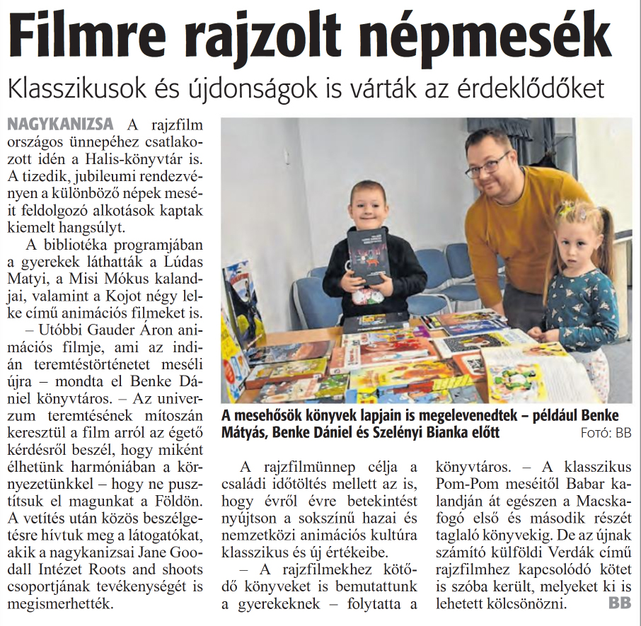 Nyilvános 856 | 1068 | Zalai Hírlap 2024. november 18. 268. szám 16. oldal | Filmre rajzolt népmesék Klasszikusok és újdonságok is várták az érdeklődőket NAGYKANIZSA A rajzfilm országos ünnepéhez csatlakozott idén a Halis-könyvtár is. A tizedik, jubileumi rendezvényen a különböző népek meséit feldolgozó alkotások kaptak kiemelt hangsúlyt. A bibliotéka programjában a gyerekek láthatták a Lúdas Matyi, a Misi Mókus kalandjai, valamint a Kojot négy lelke című animációs filmeket is. - Utóbbi Gauder Áron animációs filmje, ami az indián teremtéstörténetet meséli újra - mondta el Benke Dániel könyvtáros. - Az univerzum teremtésének mítoszán keresztül a film arról az égető kérdésről beszél, hogy miként élhetünk harmóniában a környezetünkkel - hogy ne pusztítsuk el magunkat a Földön. A vetítés után közös beszélgetésre hívtuk meg a látogatókat, akik a nagykanizsai Jane Goo-dall Intézet Roots and shoots csoportjának tevékenységét is megismerhették. A rajzfilmünnep célja a családi időtöltés mellett az is, hogy évről évre betekintést nyújtson a sokszínű hazai és nemzetközi animációs kultúra klasszikus és új értékeibe. - A rajzfilmekhez kötődő könyveket is bemutattunk a gyerekeknek - folytatta a könyvtáros. - A klasszikus Pom-Pom meséitől Babar kalandján át egészen a Macskafogó első és második részét taglaló könyvekig. De az újnak számító külföldi Verdák című rajzfilmhez kapcsolódó kötet is szóba került, melyeket ki is lehetett kölcsönözni. BB A mesehősök könyvek lapjain is megelevenedtek - például Benke Mátyás, Benke Dániel és Szelényi Bianka előtt Fotó: BB |