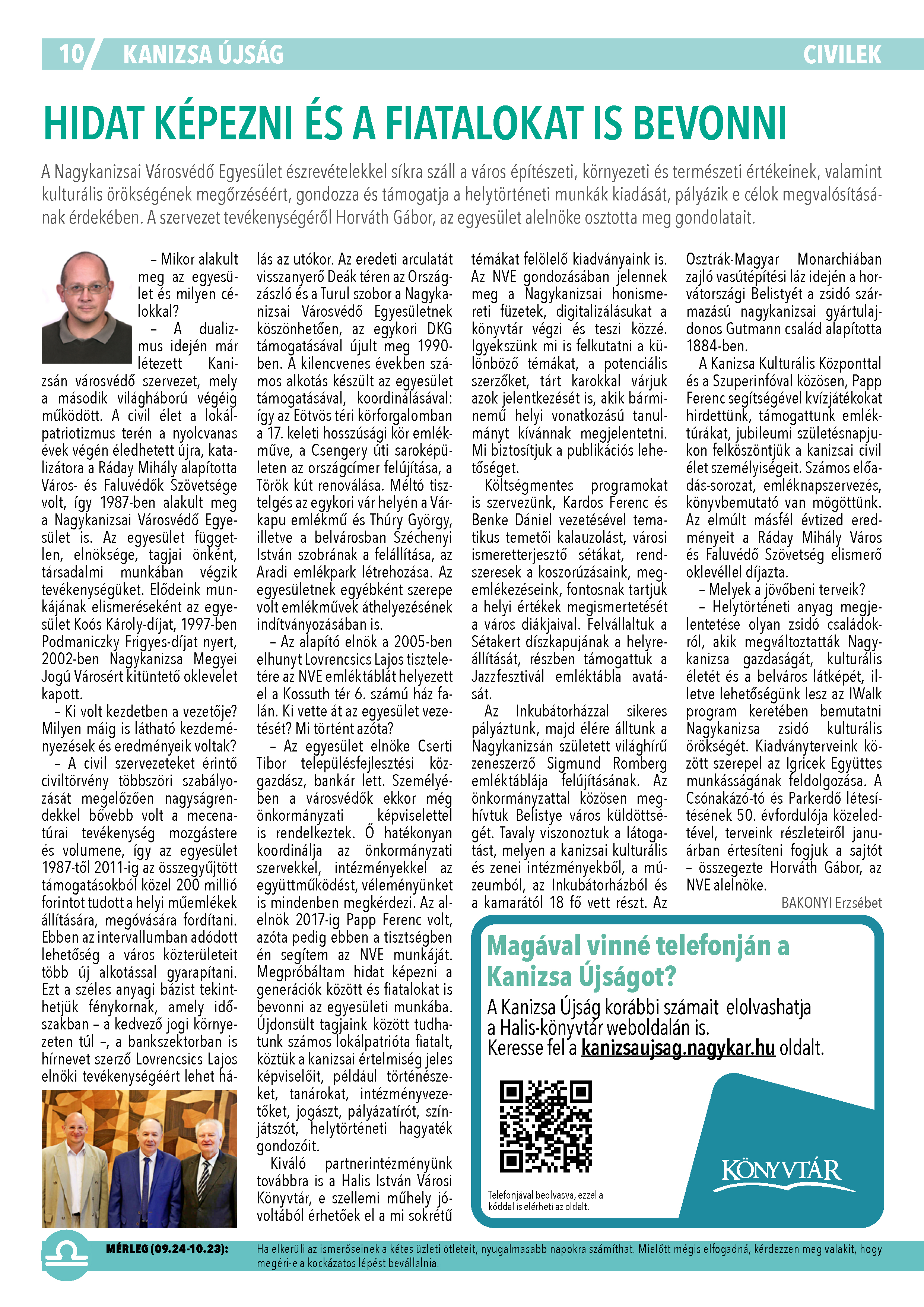 Nyilvános 1005 | 1215 | Kanizsa 2025. január 8. 1. szám 10. oldal | HIDAT KÉPEZNI ÉS A FIATALOKAT IS BEVONNI A Nagykanizsai Városvédő Egyesület észrevételekkel síkra száll a város építészeti, környezeti és természeti értékeinek, valamint kulturális örökségének megőrzéséért, gondozza és támogatja a helytörténeti munkák kiadását, pályázik e célok megvalósításának érdekében. A szervezet tevékenységéről Horváth Gábor, az egyesület alelnöke osztotta meg gondolatait. – Mikor alakult meg az egyesület és milyen célokkal? – A dualizmus idején már létezett Kanizsán városvédő szervezet, mely a második világháború végéig működött. A civil élet a lokálpatriotizmus terén a nyolcvanas évek végén éledhetett újra, katalizátora a Ráday Mihály alapította Város- és Faluvédők Szövetsége volt, így 1987-ben alakult meg a Nagykanizsai Városvédő Egyesület is. Az egyesület független, elnöksége, tagjai önként, társadalmi munkában végzik tevékenységüket. Elődeink munkájának elismeréseként az egyesület Koós Károly-díjat, 1997-ben Podmaniczky Frigyes-díjat nyert, 2002-ben Nagykanizsa Megyei Jogú Városért kitüntető oklevelet kapott. – Ki volt kezdetben a vezetője? Milyen máig is látható kezdeményezések és eredményeik voltak? – A civil szervezeteket érintő civiltörvény többszöri szabályozását megelőzően nagyságrendekkel bővebb volt a mecenatúrai tevékenység mozgástere és volumene, így az egyesület 1987-től 2011-ig az összegyűjtött támogatásokból közel 200 millió forintot tudott a helyi műemlékek állítására, megóvására fordítani. Ebben az intervallumban adódott lehetőség a város közterületeit több új alkotással gyarapítani. Ezt a széles anyagi bázist tekinthetjük fénykornak, amely időszakban – a kedvező jogi környezeten túl –, a bankszektorban is hírnevet szerző Lovrencsics Lajos elnöki tevékenységéért lehet hálás az utókor. Az eredeti arculatát visszanyerő Deák téren az Országzászló és a Turul szobor a Nagykanizsai Városvédő Egyesületnek köszönhetően, az egykori DKG támogatásával újult meg 1990- ben. A kilencvenes években számos alkotás készült az egyesület támogatásával, koordinálásával: így az Eötvös téri körforgalomban a 17. keleti hosszúsági kör emlékműve, a Csengery úti saroképületen az országcímer felújítása, a Török kút renoválása. Méltó tisztelgés az egykori vár helyén a Várkapu emlékmű és Thúry György, illetve a belvárosban Széchenyi István szobrának a felállítása, az Aradi emlékpark létrehozása. Az egyesületnek egyébként szerepe volt emlékművek áthelyezésének indítványozásában is. – Az alapító elnök a 2005-ben elhunyt Lovrencsics Lajos tiszteletére az NVE emléktáblát helyezett el a Kossuth tér 6. számú ház falán. Ki vette át az egyesület vezetését? Mi történt azóta? – Az egyesület elnöke Cserti Tibor településfejlesztési közgazdász, bankár lett. Személyében a városvédők ekkor még önkormányzati képviselettel is rendelkeztek. Ő hatékonyan koordinálja az önkormányzati szervekkel, intézményekkel az együttműködést, véleményünket is mindenben megkérdezi. Az alelnök 2017-ig Papp Ferenc volt, azóta pedig ebben a tisztségben én segítem az NVE munkáját. Megpróbáltam hidat képezni a generációk között és fiatalokat is bevonni az egyesületi munkába. Újdonsült tagjaink között tudhatunk számos lokálpatrióta fiatalt, köztük a kanizsai értelmiség jeles képviselőit, például történészeket, tanárokat, intézményvezetőket, jogászt, pályázatírót, színjátszót, helytörténeti hagyaték gondozóit. Kiváló partnerintézményünk továbbra is a Halis István Városi Könyvtár, e szellemi műhely jóvoltából érhetőek el a mi sokrétű témákat felölelő kiadványaink is. Az NVE gondozásában jelennek meg a Nagykanizsai honismereti füzetek, digitalizálásukat a könyvtár végzi és teszi közzé. Igyekszünk mi is felkutatni a különböző témákat, a potenciális szerzőket, tárt karokkal várjuk azok jelentkezését is, akik bárminemű helyi vonatkozású tanulmányt kívánnak megjelentetni. Mi biztosítjuk a publikációs lehetőséget. Költségmentes programokat is szervezünk, Kardos Ferenc és Benke Dániel vezetésével tematikus temetői kalauzolást, városi ismeretterjesztő sétákat, rendszeresek a koszorúzásaink, megemlékezéseink, fontosnak tartjuk a helyi értékek megismertetését a város diákjaival. Felvállaltuk a Sétakert díszkapujának a helyreállítását, részben támogattuk a Jazzfesztivál emléktábla avatását. A z Inkubátorházzal sikeres pályáztunk, majd élére álltunk a Nagykanizsán született világhírű zeneszerző Sigmund Romberg emléktáblája felújításának. Az önkormányzattal közösen meghívtuk Belistye város küldöttségét. Tavaly viszonoztuk a látogatást, melyen a kanizsai kulturális és zenei intézményekből, a múzeumból, az Inkubátorházból és a kamarától 18 fő vett részt. Az Osztrák-Magyar Monarchiában zajló vasútépítési láz idején a horvátországi Belistyét a zsidó származású nagykanizsai gyártulajdonos Gutmann család alapította 1884-ben. A Kanizsa Kulturális Központtal és a Szuperinfóval közösen, Papp Ferenc segítségével kvízjátékokat hirdettünk, támogattunk emléktúrákat, jubileumi születésnapjukon felköszöntjük a kanizsai civil élet személyiségeit. Számos előadás- sorozat, emléknapszervezés, könyvbemutató van mögöttünk. Az elmúlt másfél évtized eredményeit a Ráday Mihály Város és Faluvédő Szövetség elismerő oklevéllel díjazta. – Melyek a jövőbeni terveik? – Helytörténeti anyag megjelentetése olyan zsidó családokról, akik megváltoztatták Nagykanizsa gazdaságát