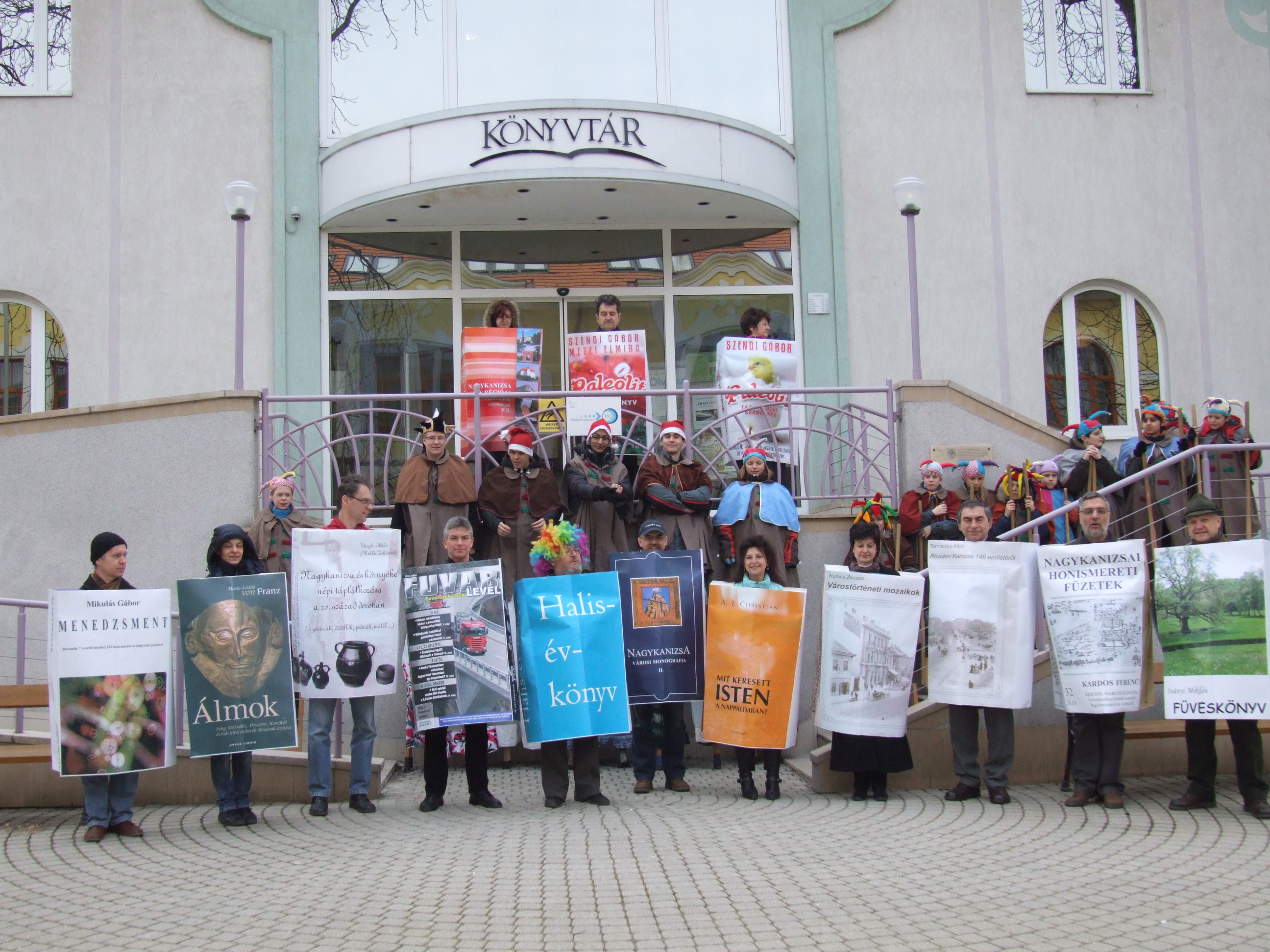 Nyilvános 1552 | 3191 | 2013. február 9. A farsangi fánkfesztiválra készülve felhívásban kértük olvasóinkat, hogy öltsék magukra kedves könyvüket. Egy „könyvespolcnyi” jelentkező vette magára kedves olvasmányát, az ő vonulásukról készültek ezek a képek. A környezetükben néhol láthatók a Nagykanizsai Gólyalábasok, akik szintén a könyvtárhoz kötődnek. A „felvonuló kötetek” a könyvtár épületében még megtekinthetők. | |