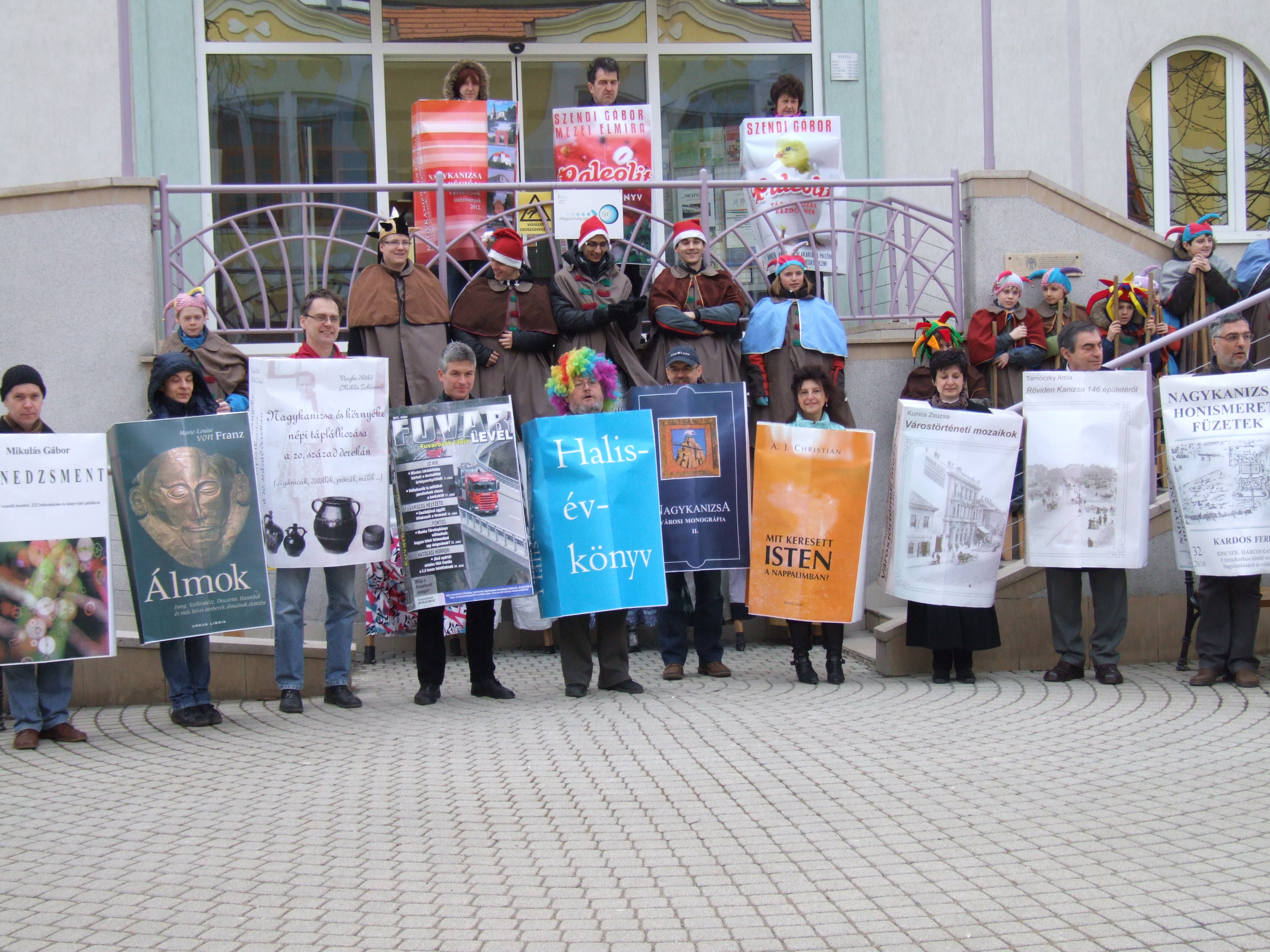 Nyilvános 1382 | 2960 | 2013. február 9. A farsangi fánkfesztiválra készülve felhívásban kértük olvasóinkat, hogy öltsék magukra kedves könyvüket. Egy „könyvespolcnyi” jelentkező vette magára kedves olvasmányát, az ő vonulásukról készültek ezek a képek. A környezetükben néhol láthatók a Nagykanizsai Gólyalábasok, akik szintén a könyvtárhoz kötődnek. A „felvonuló kötetek” a könyvtár épületében még megtekinthetők. | |