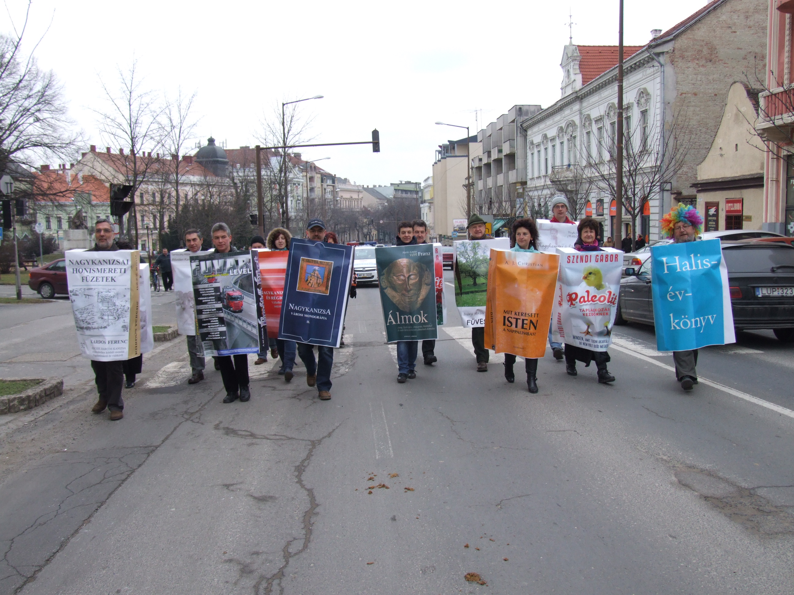 Nyilvános 1121 | 1464 | 2013. február 9. A farsangi fánkfesztiválra készülve felhívásban kértük olvasóinkat, hogy öltsék magukra kedves könyvüket. Egy „könyvespolcnyi” jelentkező vette magára kedves olvasmányát, az ő vonulásukról készültek ezek a képek. A környezetükben néhol láthatók a Nagykanizsai Gólyalábasok, akik szintén a könyvtárhoz kötődnek. A „felvonuló kötetek” a könyvtár épületében még megtekinthetők. | |