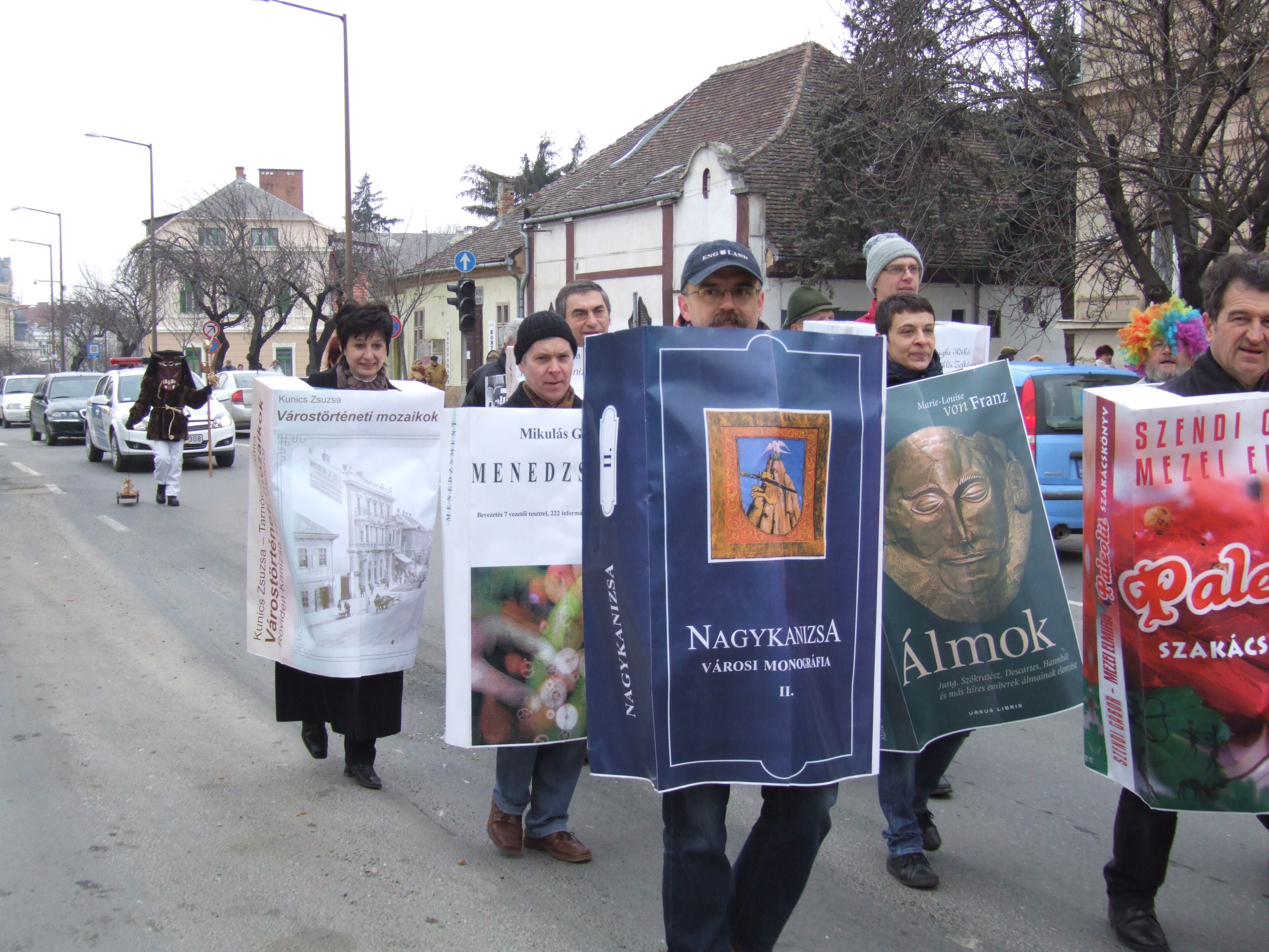 Nyilvános 972 | 1345 | 2013. február 9. A farsangi fánkfesztiválra készülve felhívásban kértük olvasóinkat, hogy öltsék magukra kedves könyvüket. Egy „könyvespolcnyi” jelentkező vette magára kedves olvasmányát, az ő vonulásukról készültek ezek a képek. A környezetükben néhol láthatók a Nagykanizsai Gólyalábasok, akik szintén a könyvtárhoz kötődnek. A „felvonuló kötetek” a könyvtár épületében még megtekinthetők. | |