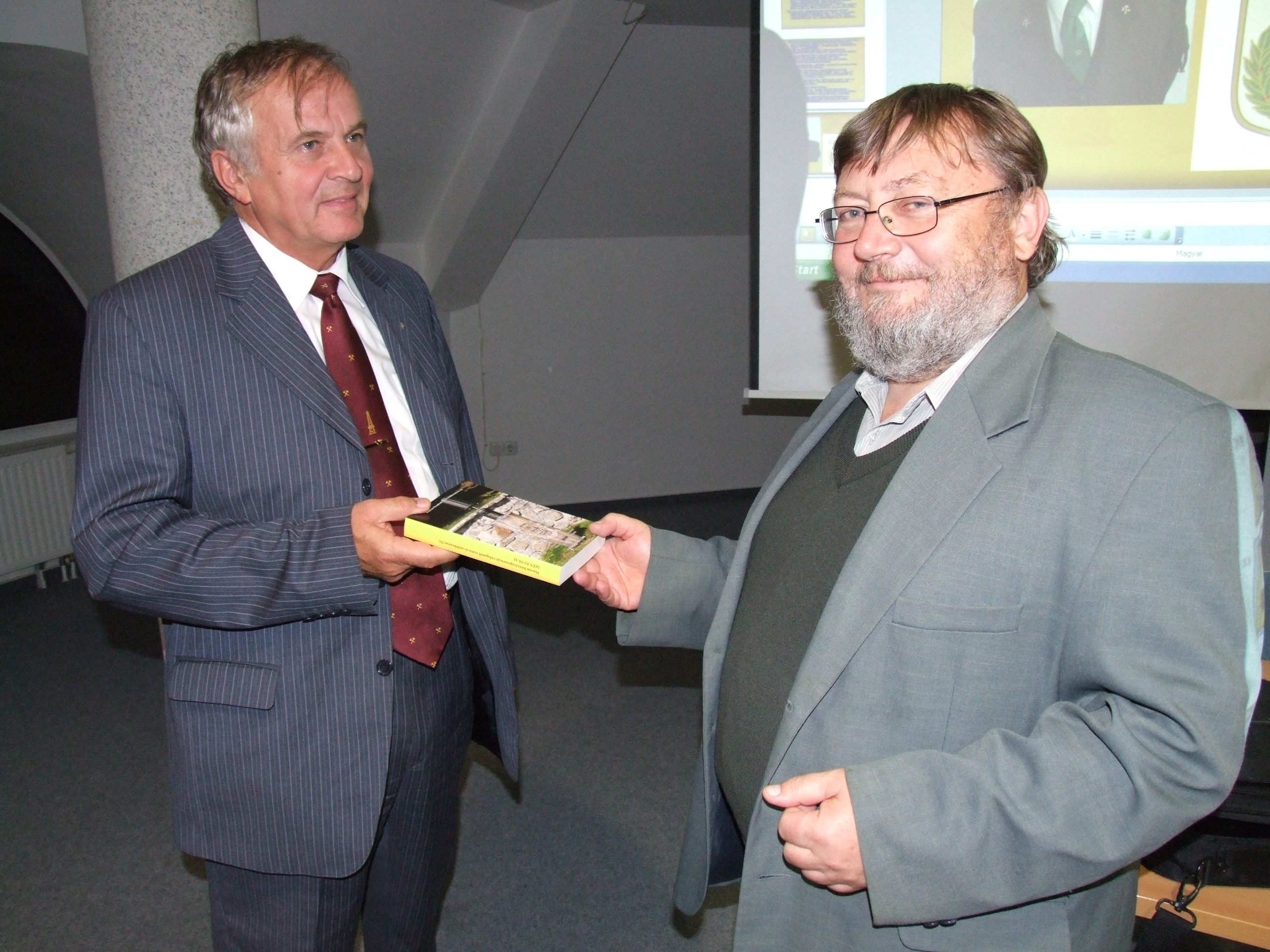 Tóth János átadja a Három bányászgeneráció válogatott iratai és emlékezései öt kötetét a Halis Könyvtárnak.JPG