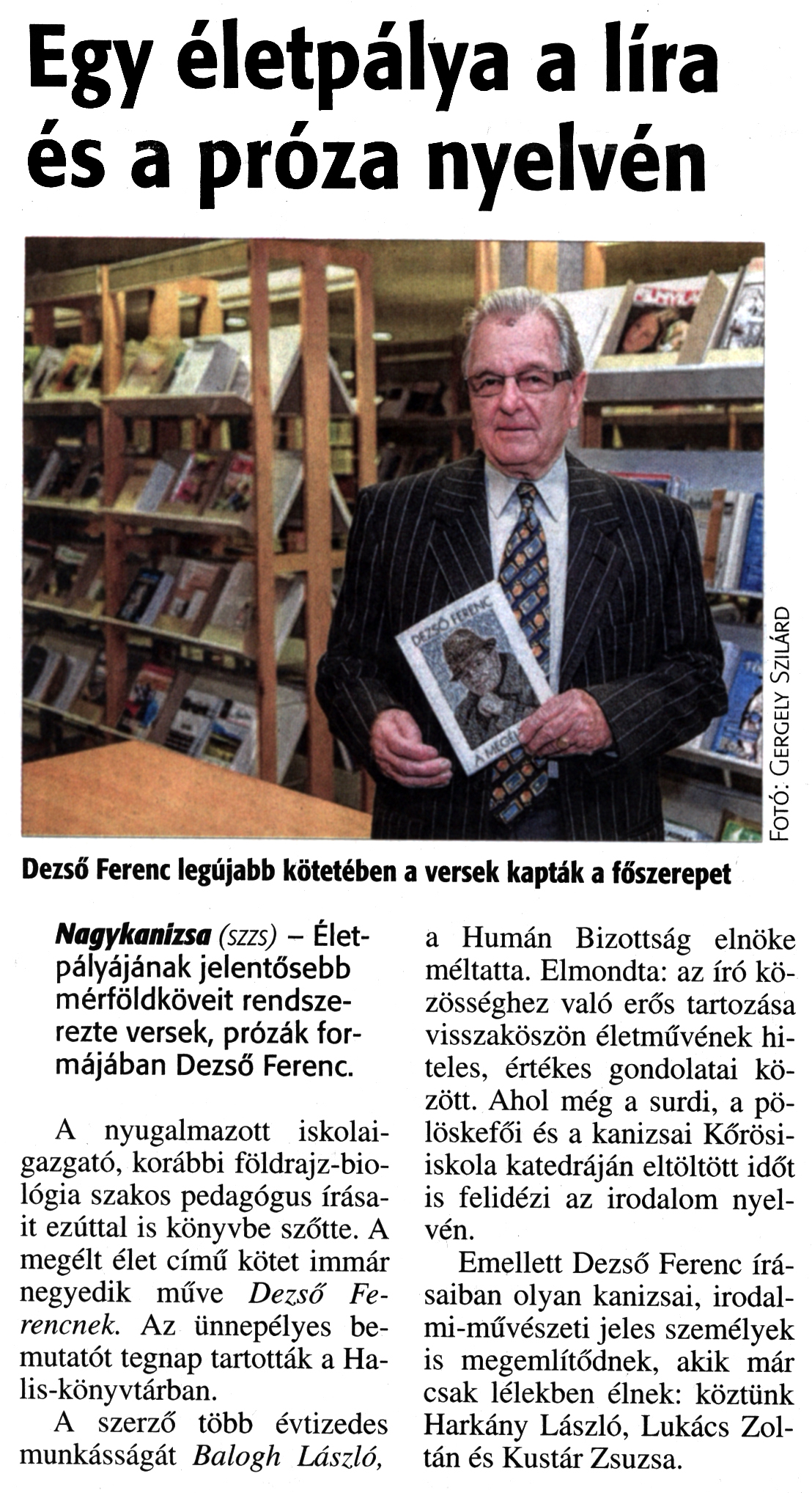 Nyilvános 1413 | 3126 | Zalai Hírlap 2016. november 9. 263. szám 3. oldal | Egy életpálya a líra és a próza nyelvén Dezső Ferenc legújabb kötetében a versek kapták a főszerepet Nagykanizsa (szzs) - Életpályájának jelentősebb mérföldköveit rendszerezte versek, prózák formájában Dezső Ferenc. A nyugalmazott iskolaigazgató, korábbi földrajz-biológia szakos pedagógus írásait ezúttal is könyvbe szőtte. A megélt élet című kötet immár negyedik műve Dezső Ferencnek. Az ünnepélyes bemutatót tegnap tartották a Halis-könyvtárban. A szerző több évtizedes munkásságát Balogh László, a Humán Bizottság elnöke méltatta. Elmondta: az író közösséghez való erős tartozása visszaköszön életművének hiteles, értékes gondolatai között. Ahol még a surdi, a pölöskefői és a kanizsai Kőrösi-iskola katedráján eltöltött időt is felidézi az irodalom nyelvén. Emellett Dezső Ferenc írásaiban olyan kanizsai, irodalmi-művészeti jeles személyek is megemlítődnek, akik már csak lélekben élnek: köztünk Harkány László, Lukács Zoltán és Kustár Zsuzsa. |