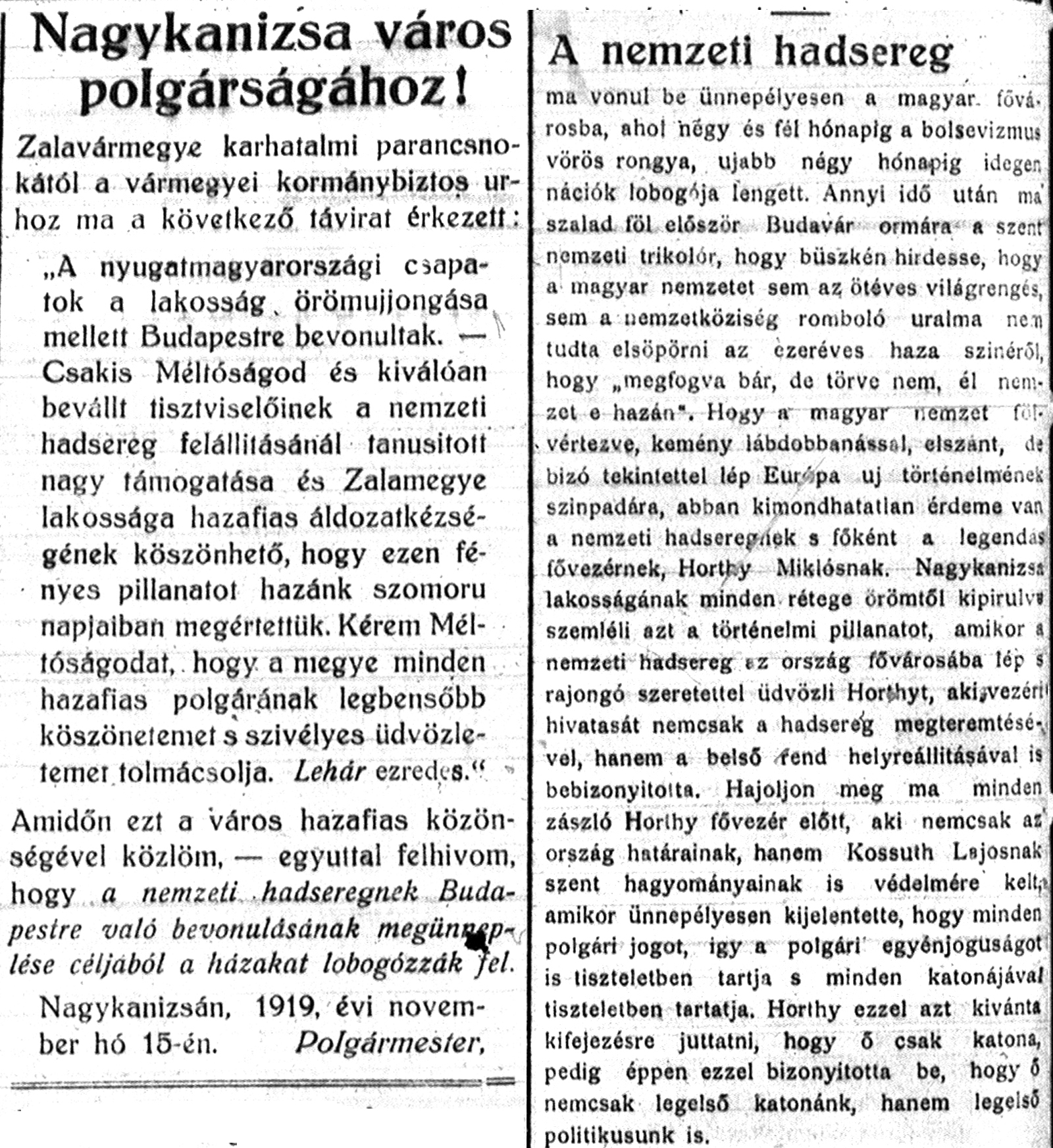 Lehár ezredes - Zala 1919